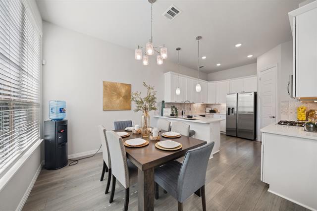 Bathed in northwest sunset glow, 744 Patriot Lane elevates Irving, Texas real estate with 2,245 sq ft of romance, practicality, and energy-smart design. Completed in 2020 by K Hovnanian, this two-story retreat welcomes you with soaring ceilings, lighting that flatters every angle, and oversized vinyl windows framing Heritage Creek’s leafy greenbelt. The open living-dining hub is anchored by a gas fireplace that promises winters spent fireside and relaxed Sunday mornings. Steps away, the chef’s kitchen gleams with quartz counters, crisp white cabinetry, a sleek cooktop, walk-in pantry, and an island ready for espresso mornings or cocktail-hour chatter. Privately placed on the main level, the owner’s suite indulges with dual vanities, a glass shower, and an oversized soaking tub where lavender bubbles erase the day. Upstairs, a glass-paneled formal office inspires focused work, while an oversized game-media room hosts movie marathons and board-game nights. Two secondary bedrooms share a Jack-and-Jill bath, and a second-floor laundry ends stair-laden chore runs. A radiant-barrier roof, advanced insulation, efficient HVAC, and double-pane windows keep energy costs low, while generous closets and attic access tame clutter. Outside, no front neighbors interrupt the view—just meadow and trail for sunrise jogs and twilight strolls. Five minutes to Highway 183 and the Bush Turnpike, ten to Las Colinas dining and Toyota Music Factory concerts, and about twenty to Dallas Love Field, DFW International, and downtown Dallas, the address balances serenity with unmatched reach to airports, employers, shopping, and Irving ISD schools.