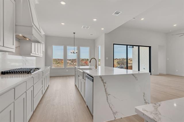 Experience a sleek and modern home, brimming with tasteful design touches and in pristine condition. The magnificent entry is bathed in natural light and welcomes visitors beneath a towering ceiling, inviting them inward. A generous living area, open to the kitchen, offers a cozy gas fireplace and a striking view through the three-panel patio door. An additional living area upstairs is ready to serve as a more private retreat. The kitchen features gleaming granite counters & island with waterfall edges, built-in ovens & gas cooktop, abundant cabinet & pantry storage, an apron sink, and a sunlit breakfast area. The split primary bedroom is spacious under a tray ceiling and includes a luxurious en suite with a soaking tub, separate glass-enclosed shower with sprayer & rainhead, dual vanities, a vast closet space, and utility room access. Out back, enjoy ample space to relax and entertain, with breathtaking views both Northward and West to spectacular Eagle Mountain Lake. Easy access to Loop 820 and mere minutes from the Lake, with fishing, boating, parks, trails, and more. Schedule your tour today and be the first tenant to ever live in this brand-new home!