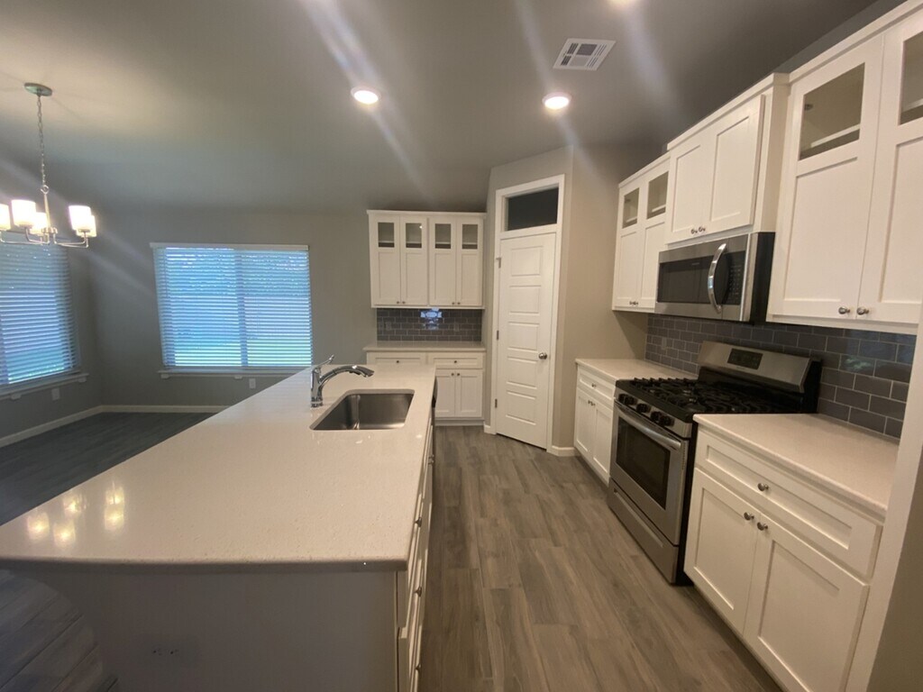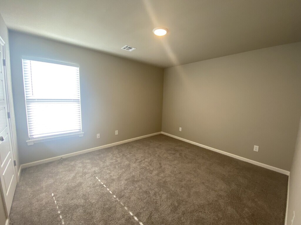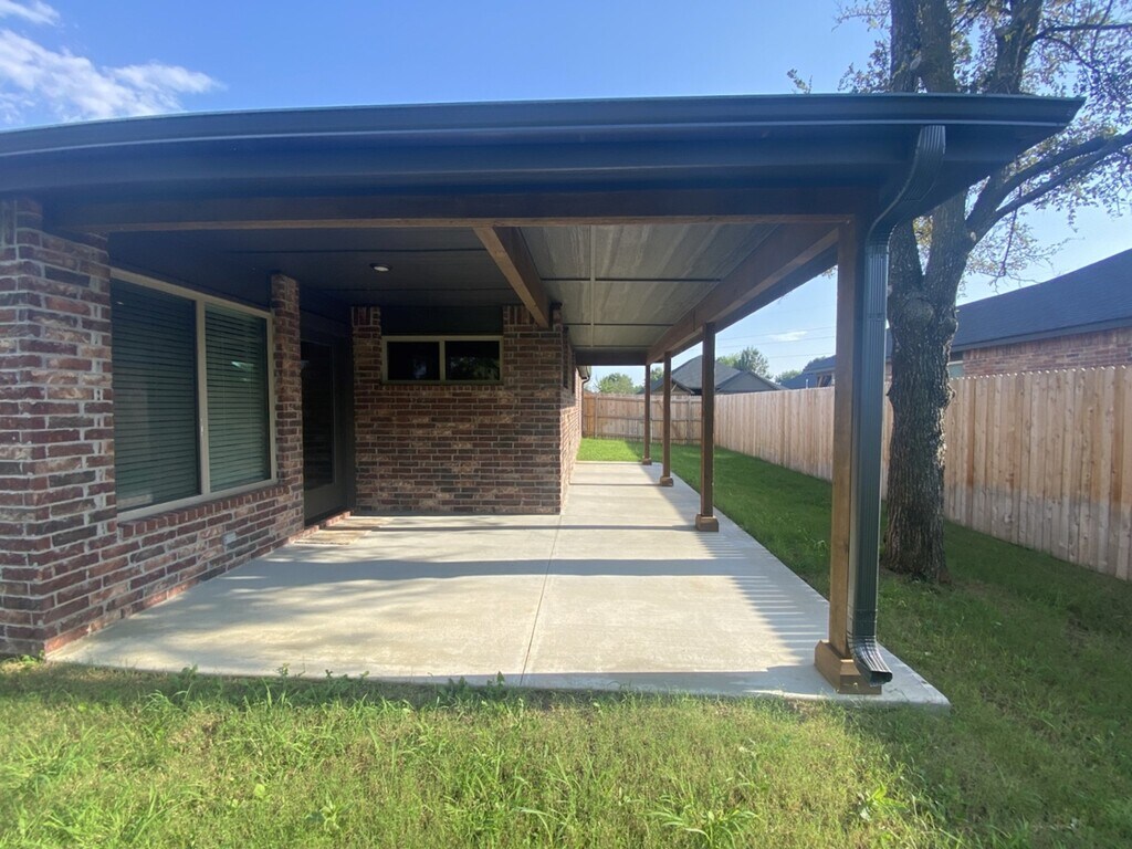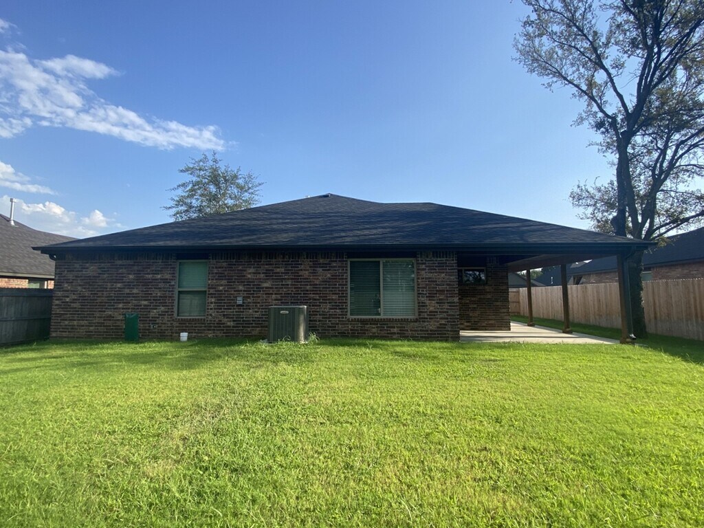 Wonderful family friendly neighborhood with walking trails, open field area, and playground in GLENPOOL School District. - Newer construction with bells and whistles! Large covered patio that overlooks full privacy fenced and beautifully maintained yard that backs to wooded, undeveloped land for additional seclusion. Sprinkler system! Hard surface flooring throughout all living areas. Carpet in bedrooms. Gorgeous quartz countertops in kitchen and baths. Open concept and split bedroom floor plan. Large center island with eating bar. Walk-in pantry, and stainless steel appliances - Refrigerator included! Master with private bath - oversized walk-in shower. All bedrooms have walk-in closets. Washer and Dryer stay! No pets please! Lawncare included in rent!