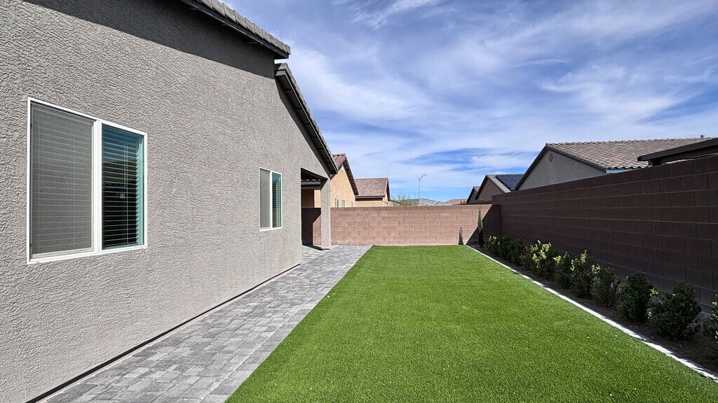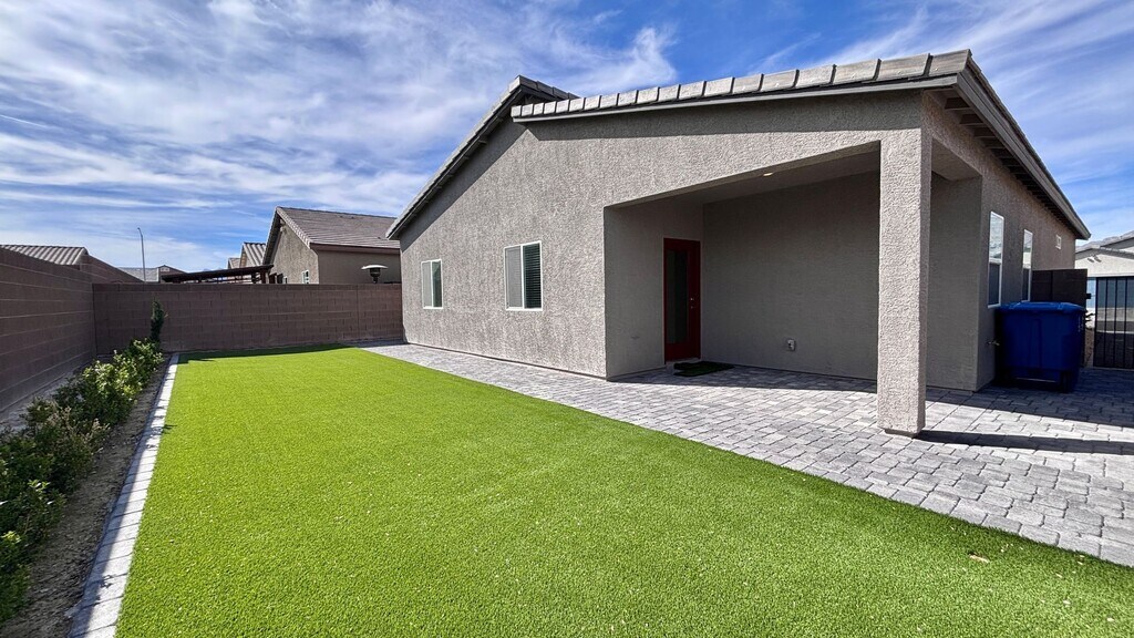 Great single-story 3-bedroom, 3 bath 2 car garage home in Tule Springs, North Las Vegas. Built in 2023 and lightly lived in, this home features tile flooring throughout with carpet in the bedrooms. The kitchen offers quartz countertops, a large island, and stainless steel appliances including an over-the-range microwave, dishwasher, refrigerator, and stove. The primary bedroom is thoughtfully separated from the other bedrooms for added privacy. The backyard is nicely sized with artificial grass and pavers, offering plenty of space to relax and enjoy.