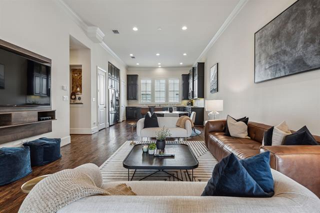 Luxurious & Immaculate Townhome located in the highly sought-after Las Colinas community. Just minutes from major highways, Downtown Dallas, the American Airlines Center, Love Field, DFW Airport, Globe Life Field, and AT&T Stadium. The gourmet kitchen boasts premium, Thermador appliances, built-in refrigerator, and an under-counter beverage cooler —perfect for hosting gatherings in style. The immaculate two-car garage features EV CHARGING STATION, durable Polyaspartic flooring, wall-mounted storage systems, and under-stair storage to keep everything neat and organized. Start your mornings with coffee or wind down with cocktails on the second-floor balcony overlooking the resort-style pool. For the ultimate escape, head to the rooftop terrace where outdoor furnishings are provided, to enjoy panoramic sunset views and the Las Colinas skyline. Every bedroom includes its own ensuite bath for maximum comfort and privacy. Living Room and Primary Bedroom TV's provided. The first-floor bedroom is complete with a built-in Murphy bed and also functions perfectly as a home office with a desk and chair provided, or a guest suite. Additional storage includes mudroom cabinetry at the garage entry, a floored attic, and multiple spacious closets throughout. Enjoy the best of urban living within walking distance to the DART station, The Toyota Music Factory, award-winning restaurants, cafes, and vibrant Levy Plaza; a year-round hub for BBQ, live music, and community events. WIFI included in monthly lease amount. All photos with furniture are previously staged, except for living room and primary bedroom TV's, as well as outdoor furniture on terrace. This is more than just a home, it’s your gateway to the Las Colinas lifestyle.