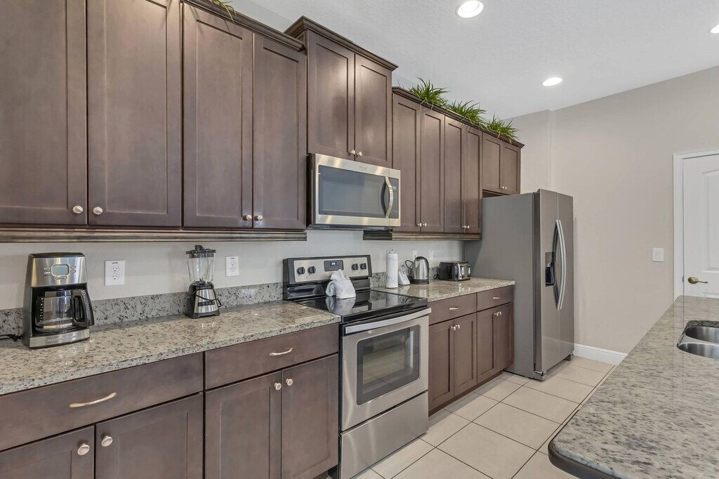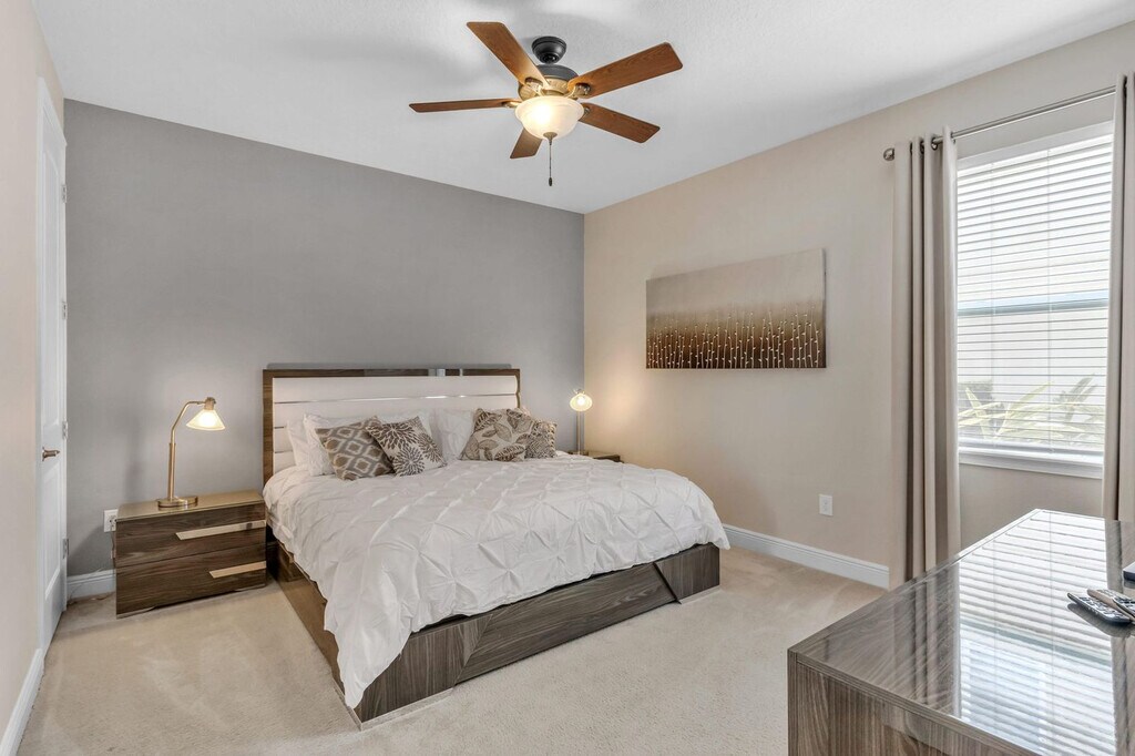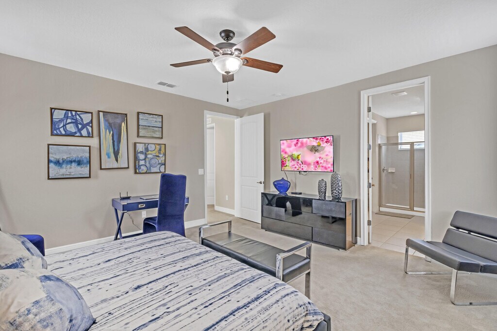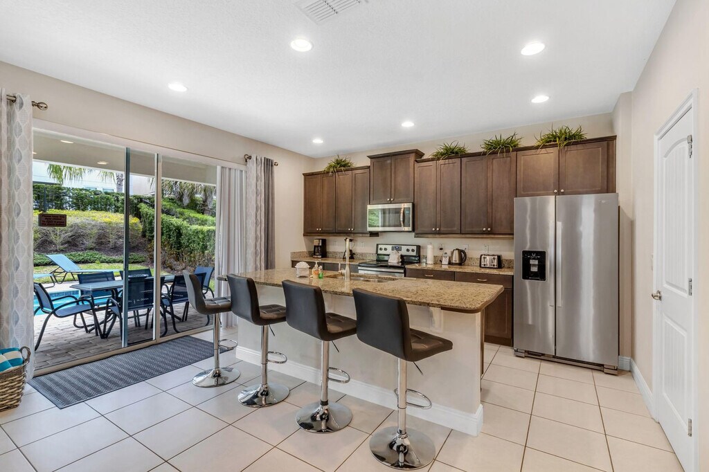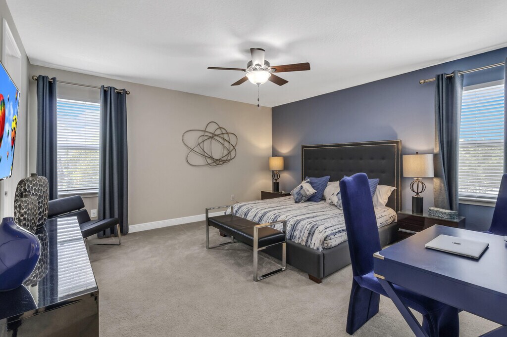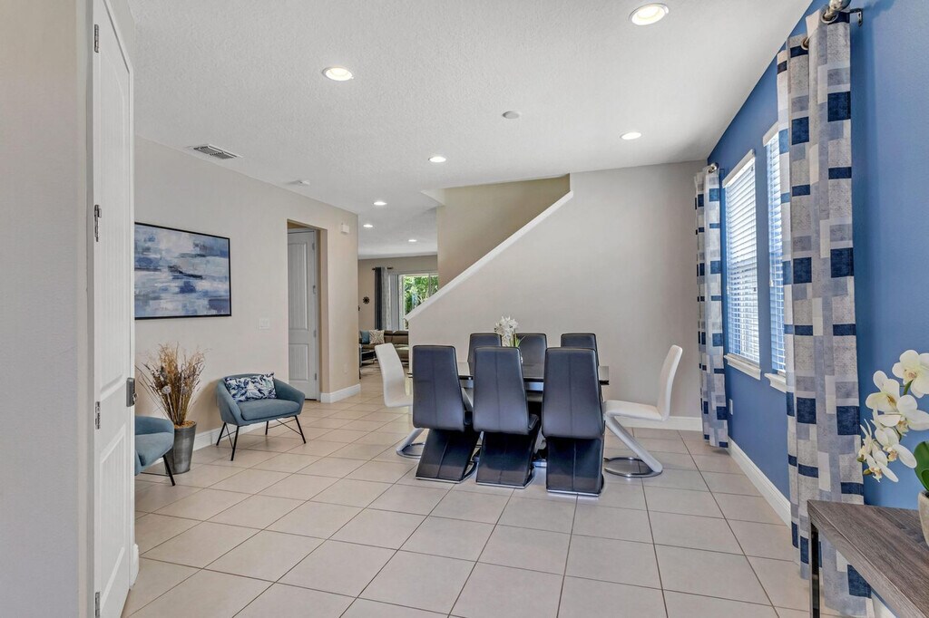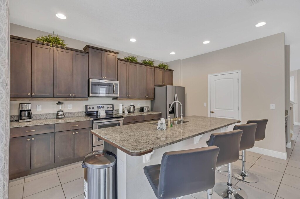 This 6-bedroom, 6-bathroom villa offers a perfect retreat for travelers looking to unwind after a busy day. Situated in the vibrant area of Four Corners, this home provides easy access to local attractions such as the Mystic Dunes Golf Club, ChampionsGate Golf Club, and Magic Sunrise Ballooning. The villa's open floor plan downstairs includes a king bedroom with a full bathroom right outside the door, a game room filled with fun games, and a spacious living room and kitchen ideal for gatherings. The villa features a private pool and spa, with pool and hot tub heating available for an additional fee. Guests can enjoy the convenience of a fully equipped kitchen and smart TVs in all bedrooms. A washer and dryer are available 24 hours for guest use. Guests have access to the entire house, including a driveway that accommodates 2 cars and overflow parking down the road. The garage is converted into a game room and cannot be used for parking. A small 18-inch charcoal grill is provided at no cost upon request, and arrangements can be made for a propane/gas grill or other vacation gear. Pool and spa heating is available for a fee of $45 per day with a 2-day minimum. Located just 5 minutes from MargaritaVille Sunset Walk and close to Oldtown Kissimmee, guests have a variety of entertainment options nearby. Walt Disney World® is only 6.5 miles away, Universal Studios® is 20 miles, Sea World® is 17 miles, and shopping outlets are 15 miles away. The Orlando Airport is 29 miles from the villa, and a supermarket is conveniently located 1.5 miles away. No pets are allowed in the villa. The property is equipped with a blink camera outside at the front door and side of the house. Linens and towels are provided at the start of your stay, but washcloths are considered personal items and are not provided. Guests are advised to inform the host 48 hours in advance for pool and spa heating arrangements. [SI]