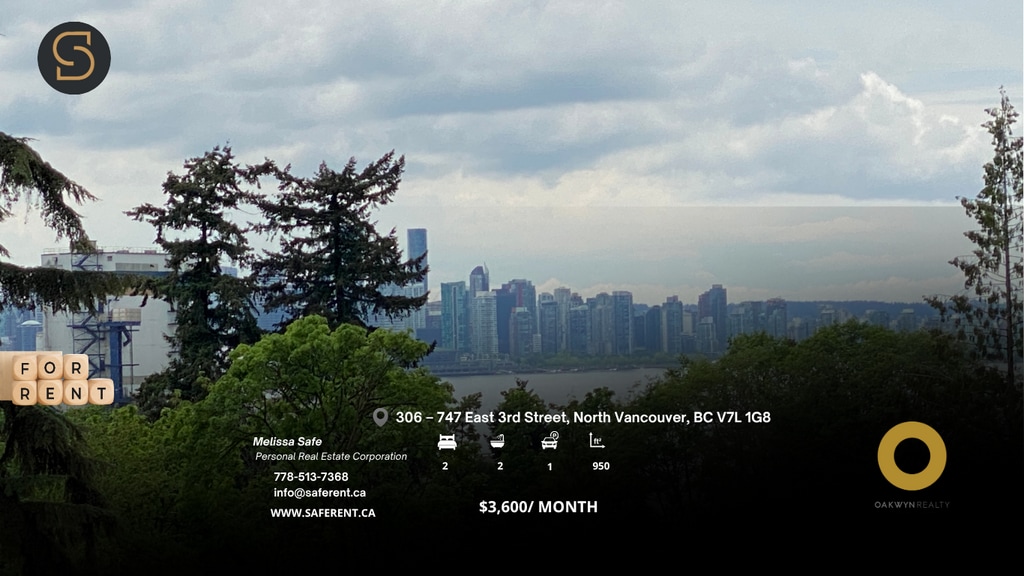 Rare south-facing 2-bedroom + den with a house-sized kitchen, large balcony overlooking Queensbury Park, and A/C. Heating and cooling costs are included. Conveniently located near The Spirit Trail, just a block south of Queensbury Village, and within walking distance to Lonsdale Quay. Building Amenities: BBQ and outdoor social lounge Private fitness room Indoor & outdoor social lounges Communal media center Car wash stations Rentable guest suite Note: Photos are for marketing purposes and have been virtually staged. Requirements: Minimum 1-year tenancy Tenancy insurance required Move-in fee applicable Interested? Please reply with: Do you have a pet? Desired tenancy start date Employment status Annual income Number of occupants Contact email & cell phone Book a Showing/Online Application: Message us for the link. Listed by Melissa Safe Personal Real Estate Corporation, Oakwyn Realty ltd.