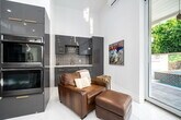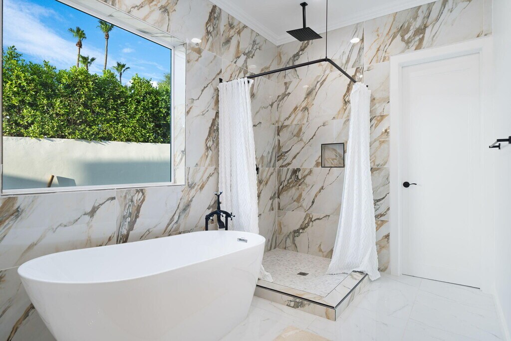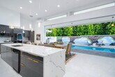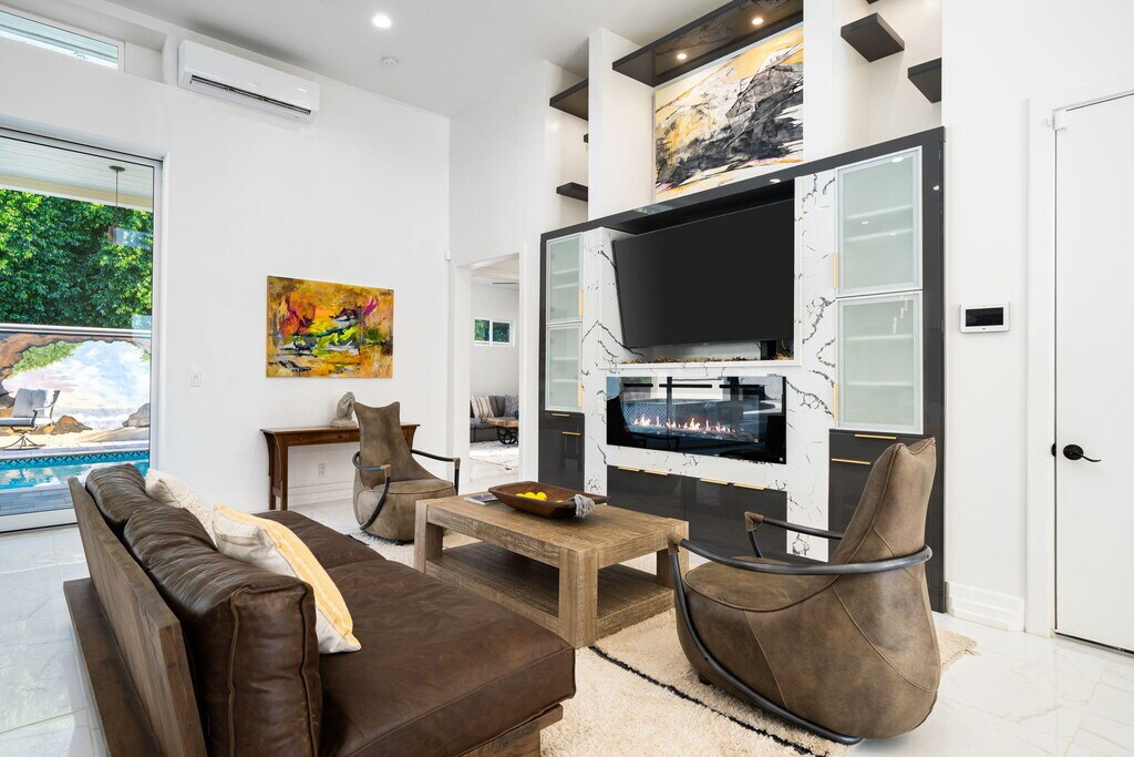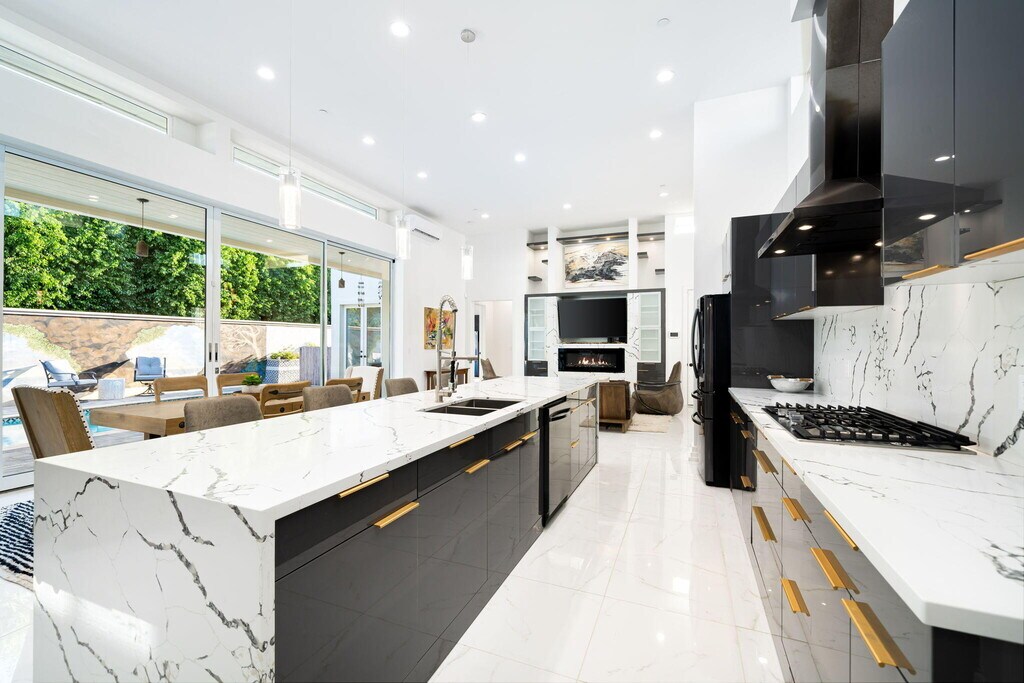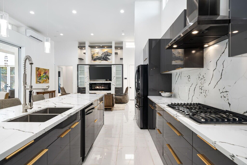 El Paseo shopping district,this nearly new custom home blends artistic style and opulent luxury in a generous single-level design. A private cul-de-sac homesite of nearly 10,019 s. f. reveals a pool and spa,custom mural,a fireplace and built-in BBQ. Custom etched-glass entry doors open to a spacious and welcoming great room that looks out to the pool and mural through massive slide away glass doors. Crowned by a high ceiling with clerestory windows,this fabulous space combines a living room with linear fireplace and custom built-ins,a dining room with wet bar,and a stunning European-inspired kitchen with custom high-gloss cabinetry,an oversized double-waterfall island with seating,quartz countertops,a full backsplash,walk-in pantry,and black-stainless Samsung appliances including a double-oven,French-door refrigerator and five-burner cooktop. Approximately 3,755 square feet,the home ensures comfort and privacy with five ensuite bedrooms and six baths. One bedroom is ideal for guests and boasts a kitchenette,washer and dryer and separate entrance. The primary suite opens to the outdoors via three sets of French doors and hosts a bar with wine refrigerator,a freestanding tub,walk-in rain shower,walk-in closet and LED mirrors. Embellishments throughout the residence include custom glass doors and shower enclosures,large-format porcelain tile,on-trend LED lighting fixtures,art niches and more. Flex Solar on property. MLS # 219143636