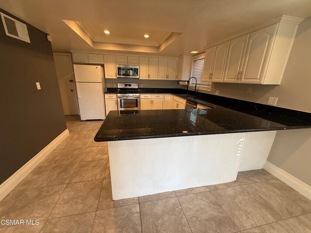 Welcome to this beautifully remodeled home with stunning views in the heart of Thousand Oaks! A charming, drought-tolerant landscaped walkway leads you to the inviting entry and into a bright, open living room featuring a cozy fireplace. The spacious, updated kitchen offers abundant cabinetry, stainless steel appliances, and flows seamlessly into the family room, which is perfect for everyday living and entertaining. Upstairs, you'll find generously sized secondary bedrooms complete with ceiling fans, ample closet space, and plush carpeting. The stunning hallway bathroom is complete with a large bathtub and shower and thoughtful upgrades. The light-filled primary suite boasts a large closet and a sliding door that open to beautiful scenic views. The attached bathroom has been tastefully updated and includes a well-sized bathtub for relaxation. Step outside to your private backyard oasis, featuring a covered patio, low-maintenance drought-tolerant landscaping, and plenty of space to entertain, which is all set against a backdrop of breathtaking views. An additional lower-level area provides even more flexible space to suit your needs. Additional highlights include tile flooring throughout the downstairs, window coverings, recessed lighting, updated light fixtures, an updated powder room, and an indoor washer and dryer. Ideally located near excellent shopping and dining, this home is also part of the highly regarded Conejo Valley Unified School District.