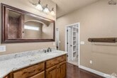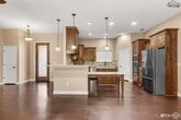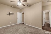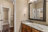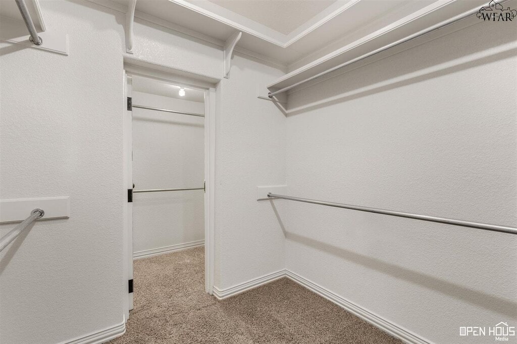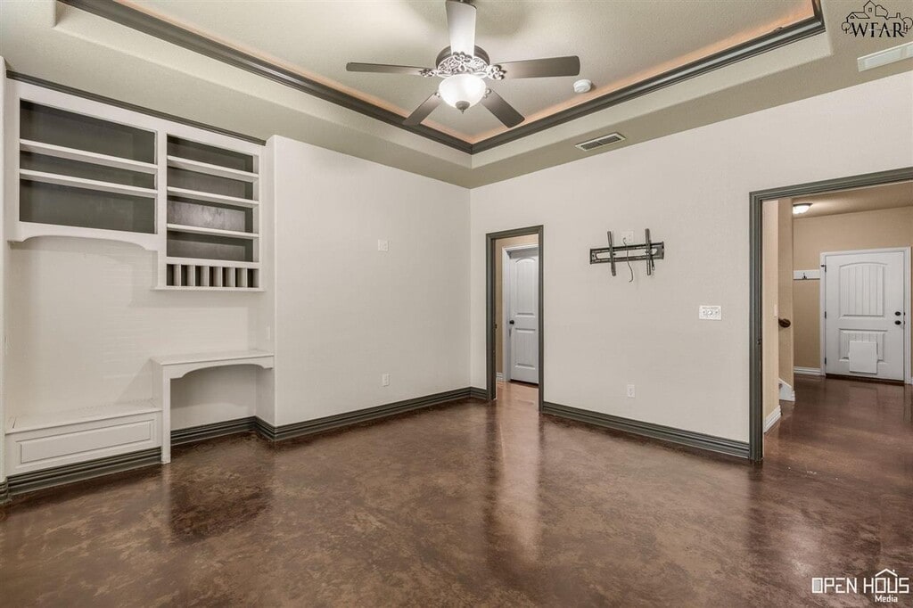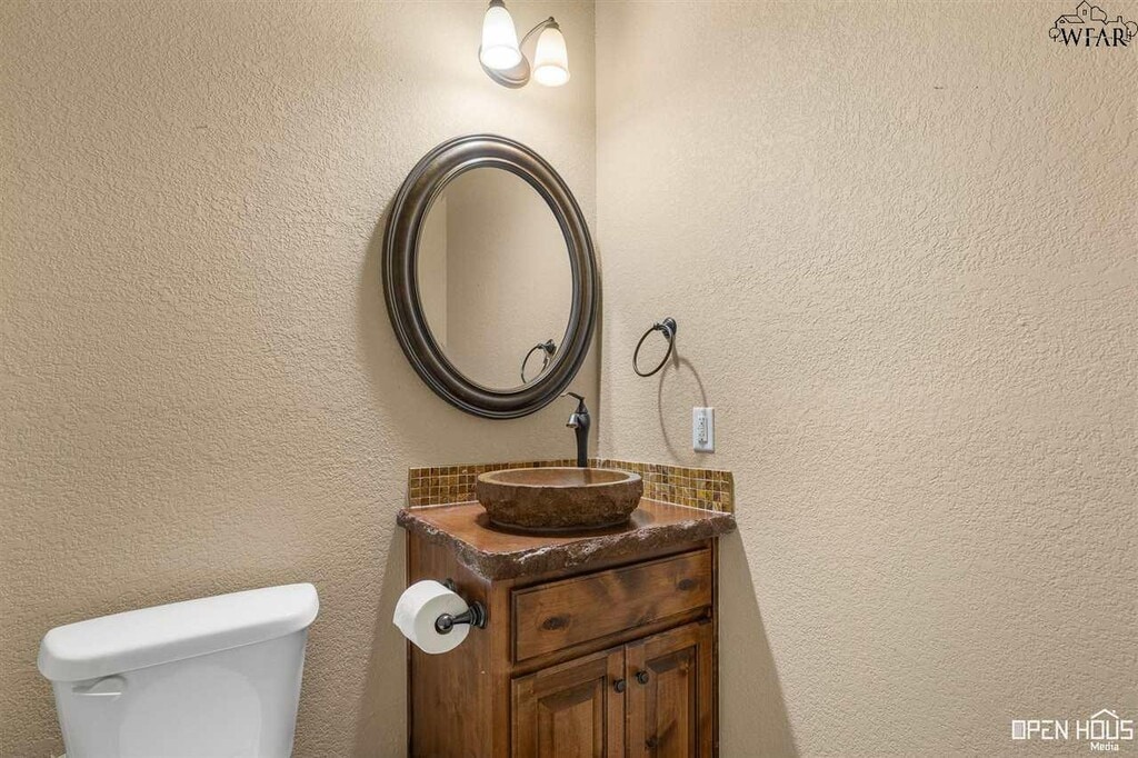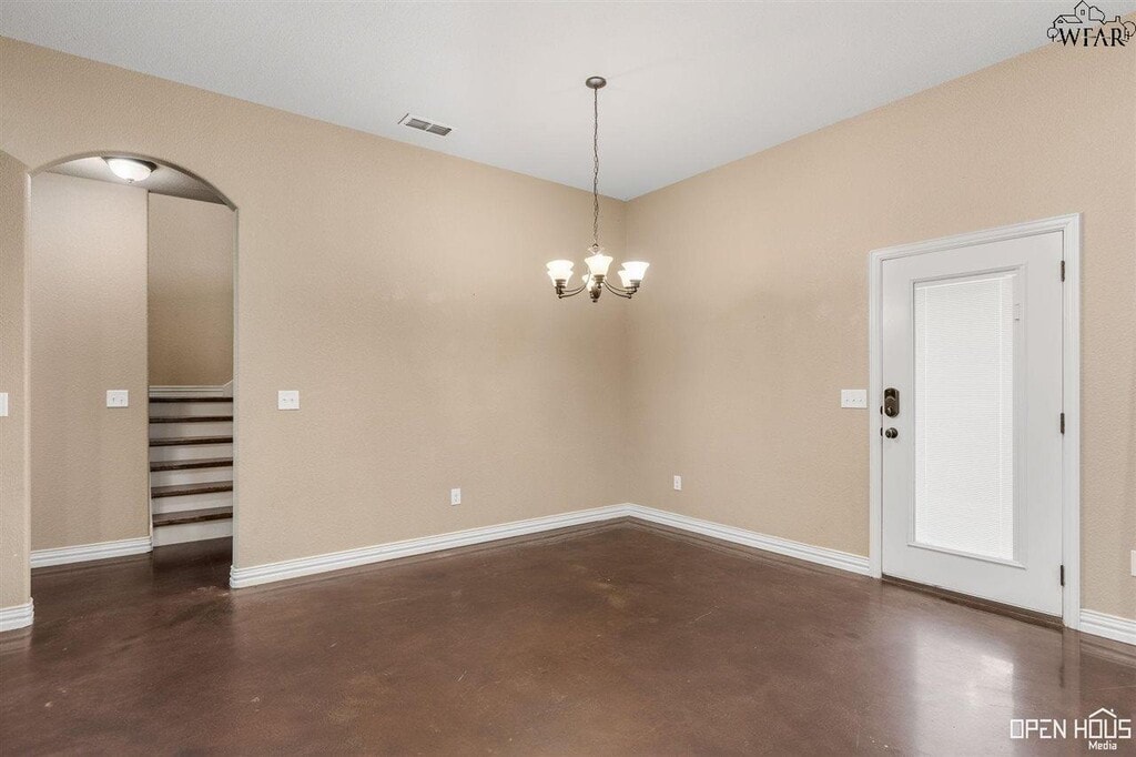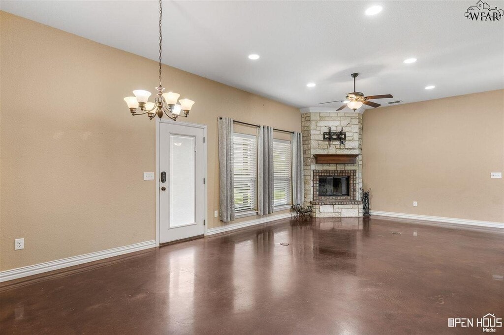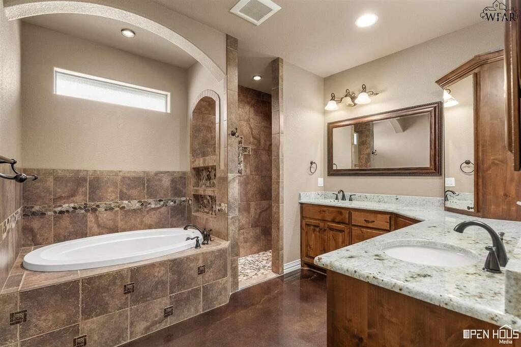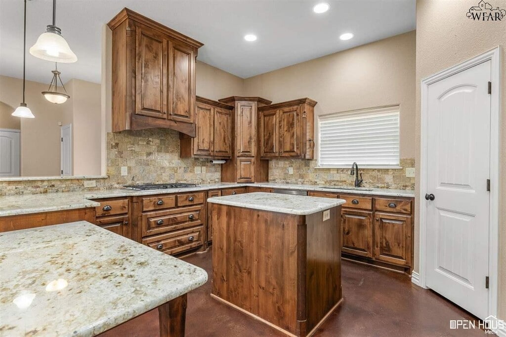 This luxurious rental has 4 bedrooms and an upstairs bedroom with incredible views of Burkburnett. This house comes with 5 acres of land and a fenced in backyard. 2 of the bedrooms are connected with a Jack and Jill bathroom. The primary bedrooms offers privacy and a spa like es suite bathroom that features a soaker tub and a walk-in shower. In the kitchen you have granite counter tops w/ a breakfast bar and a gas cook top . In the laundry room there is a hanging rack for clothes and cabinets for storage.