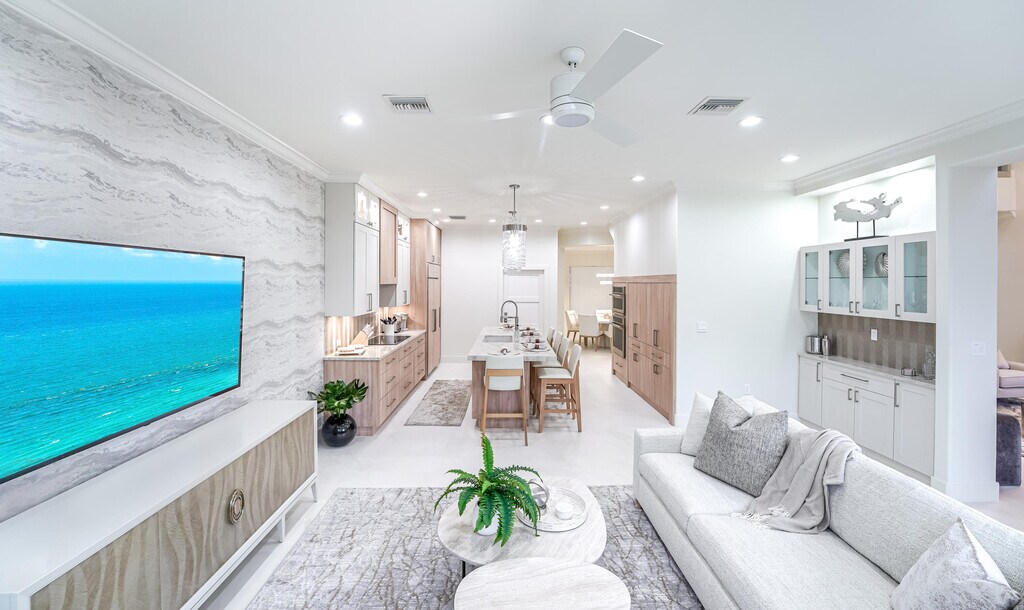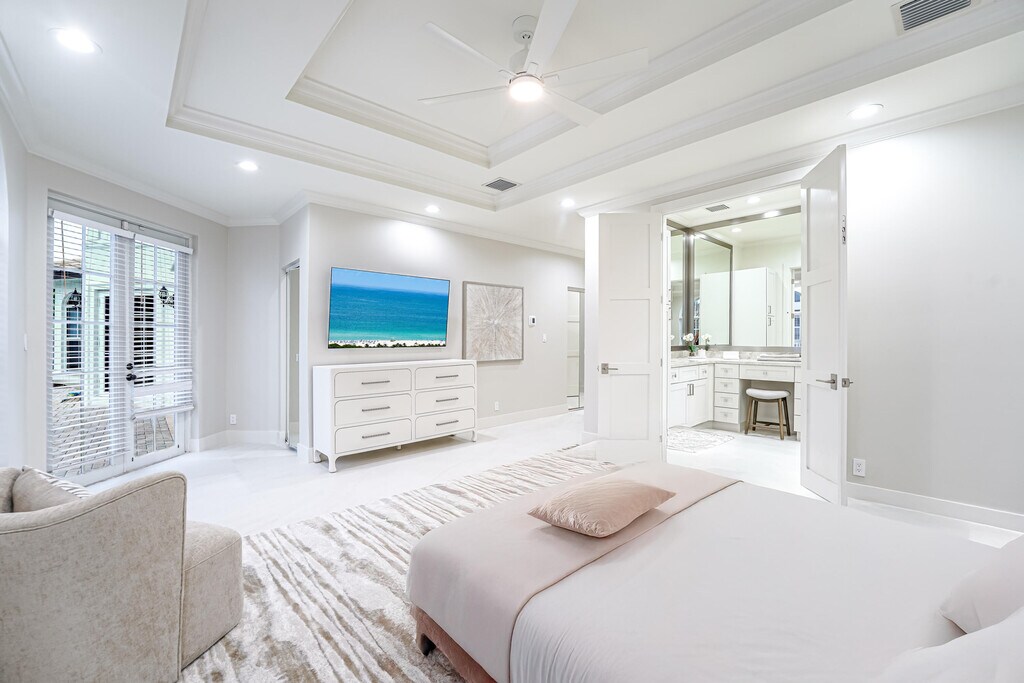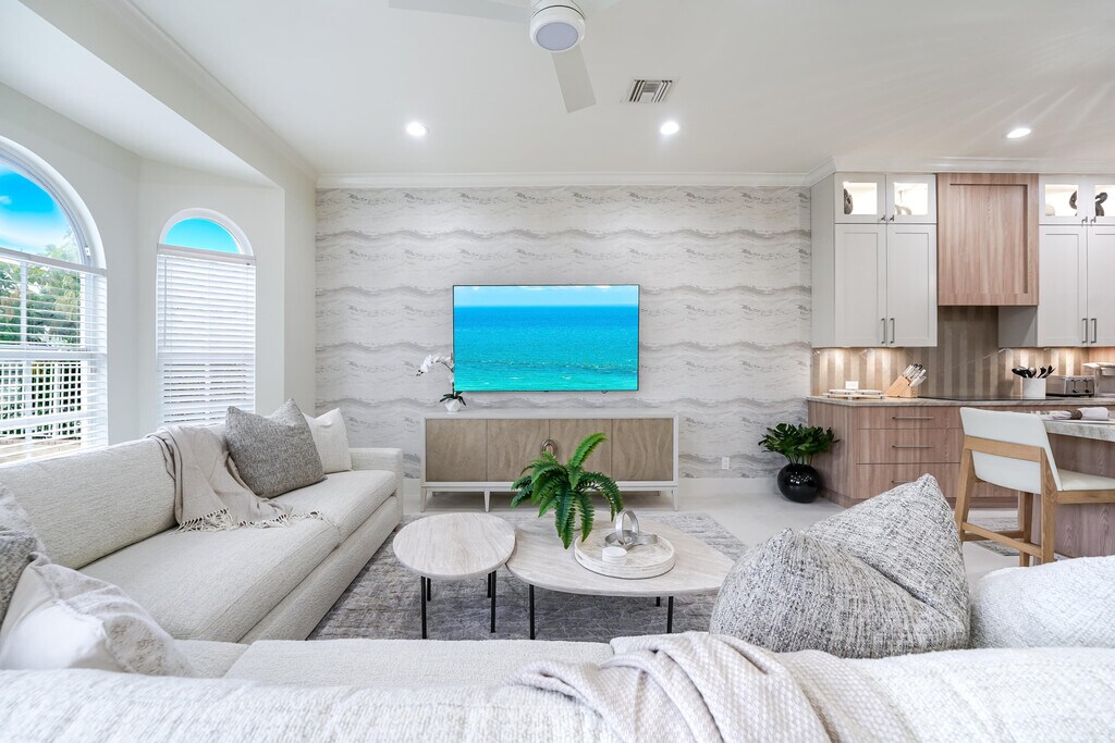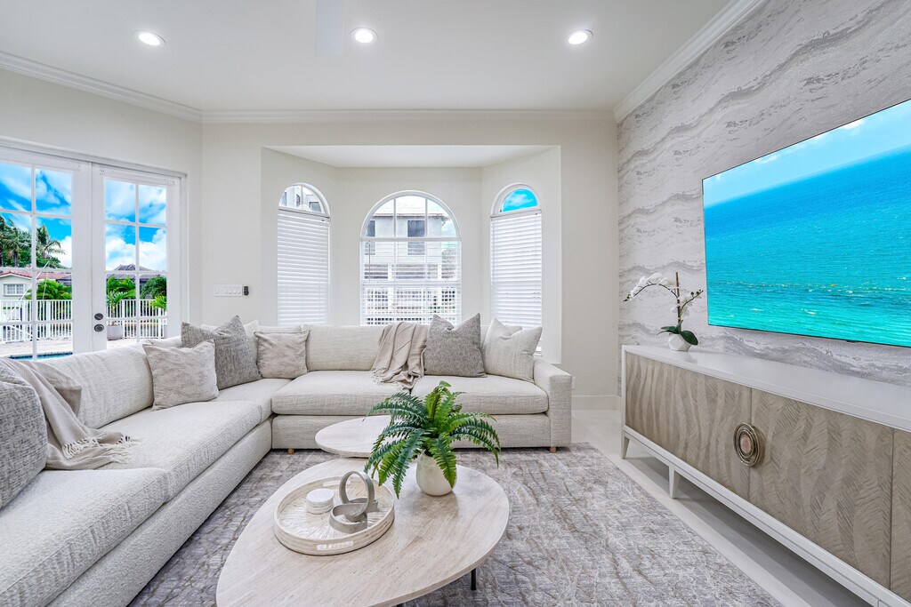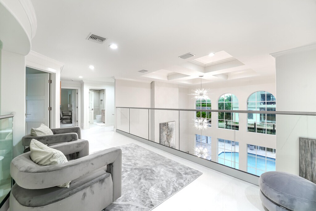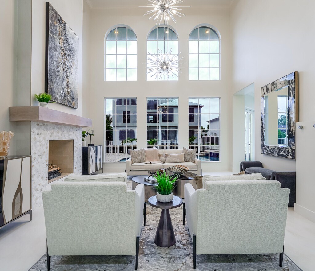 A Statement of Prestige, meticulously and totally redesigned residence! This stunning property boasts 5 bedrooms plus and OFFICE! 5 bathrooms, 3 car garage, pool area plus a Tiki house and 80' water frontage of unrivaled grandeur in the prestigious Boca Harbour community. Step inside and be greeted by a grand fireplace mantel adorned with stone, vibrant large matte porcelain tile flowing through the entire property, soaring ceilings large windows that provides abundant natural light. A Modern elegance adorned by neutral brand new furniture creates a stunning, inviting, cozy environment accented with glass railing and brushed nickel hardware seamlessly integrated across the home. New Monogram appliances offer blend cutting edge technology & refined culinary experience. Built in fridge