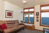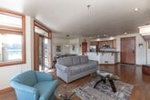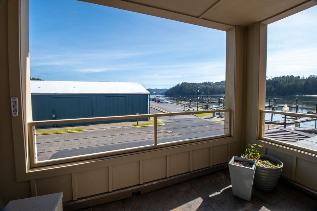 Elegant riverfront condo in Oldtown Florence - Stunning views of the river and marina. Thoughtfully designed with high-end finishes, this furnished unit features tile flooring, granite countertops, and stainless steel appliances, and comfortable, usable space. The open-concept living area boasts a cozy gas fireplace, while the south/east-facing covered balcony provides the perfect space to relax and take in the scenery. The gourmet kitchen includes a pantry, breakfast bar, and beautiful cabinetry. Retreat to the spacious primary suite, complete with a jetted tub and a walk-in closet. Additional amenities include a beautiful central atrium with natural lighting, secure parking, and an elevator for easy access.