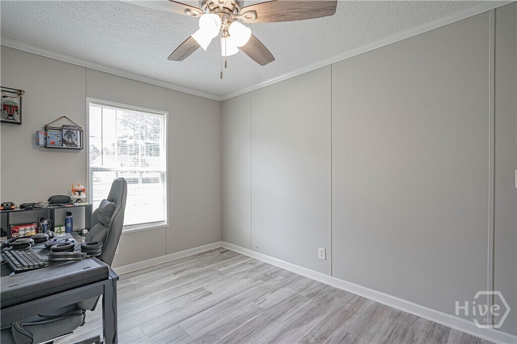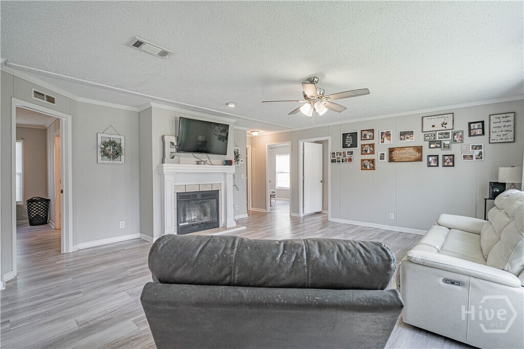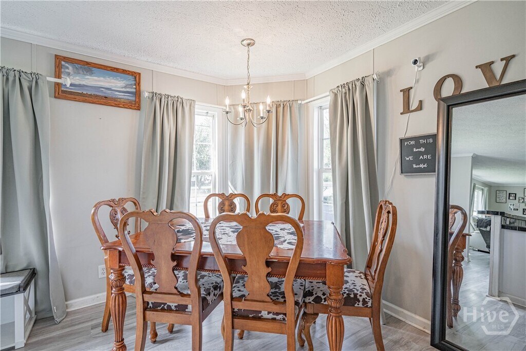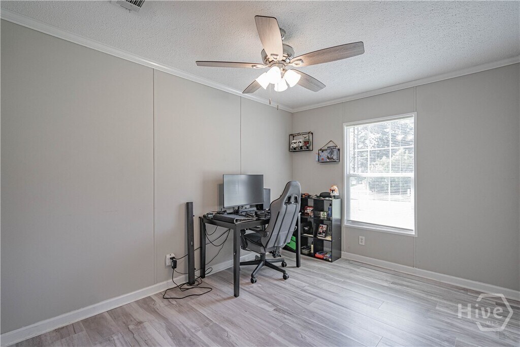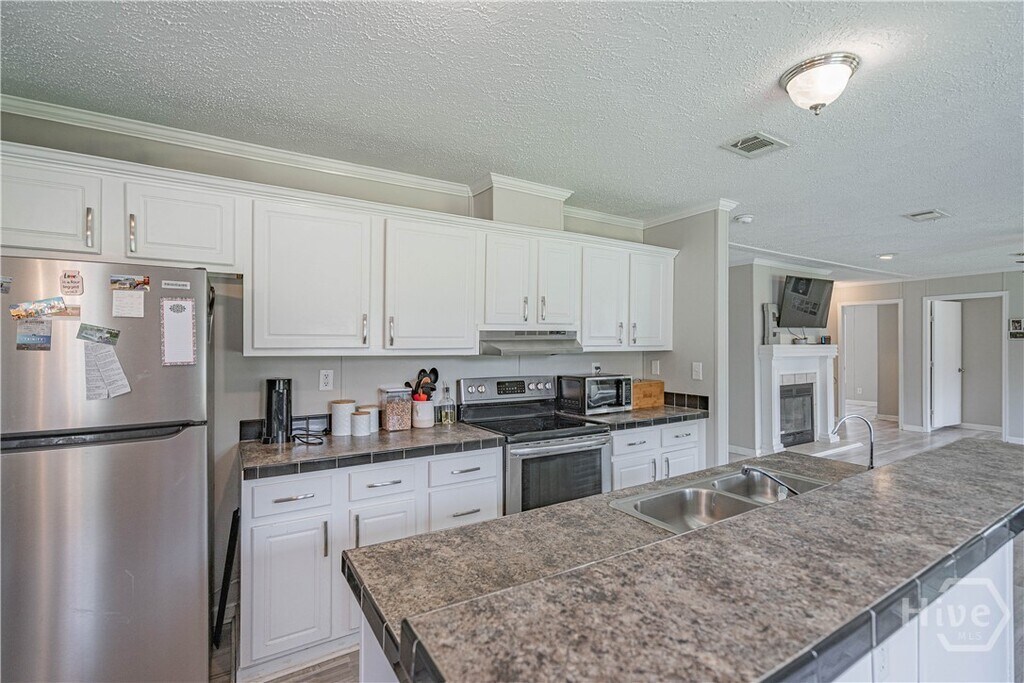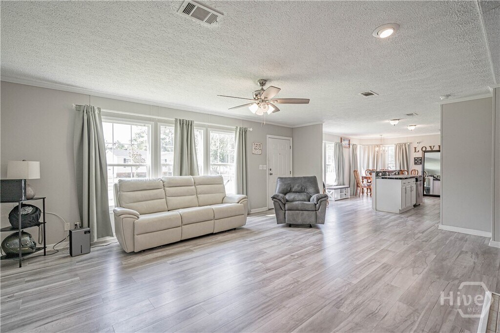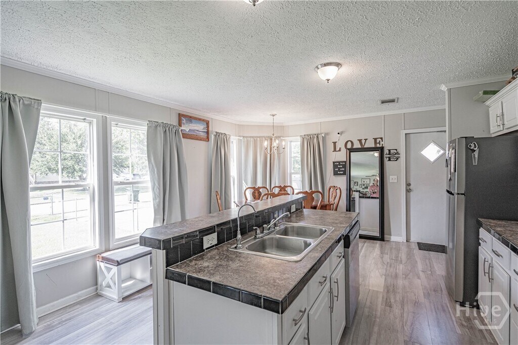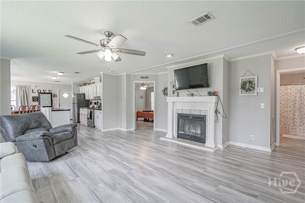 This charming 3-bedroom,2-bath home offers the prime location just minutes from shopping,dining,and Fort Stewart. The kitchen is a true highlight,showcasing stainless steel appliances,a spacious island with breakfast bar seating,abundant cabinetry,and a pantry for extra storage. A large laundry room sits just off the kitchen for added ease. The inviting living room features a cozy fireplace,perfect for gatherings or quiet evenings at home. The primary suite includes a spacious closet and a private bath with dual vanities,a soaking tub,and a separate shower. Step outside to a fenced backyard with a covered porch and a detached storage building. No smoking. Pets negotiable. Available mid October.
