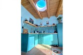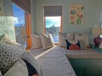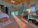 Feel at home in Studio Cielito, a desert-inspired cottage designed with bath lovers in mind. This one-story rental offers amazing views of three acres of rolling, juniper-filled property. Curated with vintage touches and luxury linens, this former pottery studio has been transformed into an inviting cabin, with a built-in seating area, kitchen, and sleeping nook in one large, light-filled structure. High ceilings complete with traditional wood vigas beams and a circular skylight stream in the moonlight. The vintage clawfoot tub in the new attached bathroom sits under a massive skylight for midnight soaks. The bathtub has a hand shower, but there is no standing shower in this unit. This unit has everything needed to make breakfast, lunch, and simple dinners. The bedroom nook includes a Helix queen mattress, luxury linens, two types of pillows, and Euro shams. This is a pet-friendly unit, and to keep it sparkling clean, there is an additional $100 cleaning fee per pet for your stay, maximum of 2 pets, not exceeding 100 lbs total, and there is an extra $50 guest fee for use of the daybed. It’s best to have a rental car, and parking is provided. Located just 8 minutes from Meow Wolf and 14 minutes from The Plaza, Studio Cielito is surrounded by nature with a country feel in the traditional village of Agua Fria, nestled just west of downtown Santa Fe. It's close to everything but far enough not to hear it all. You'll be fifteen minutes away from the center of downtown Santa Fe but be able to wake up in the morning to rolling hills and hiking trails directly behind the house. You’re fifteen minutes from the Santa Fe Opera, twenty minutes from Ten Thousand Waves Japanese Spa, forty-five minutes from the ski slopes, and an hour from Georgia O’Keeffe’s Ghost Ranch in Abiquiu. In the winter in Santa Fe, it is recommended renting something with four-wheel drive to get around. [SI]