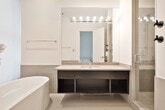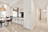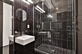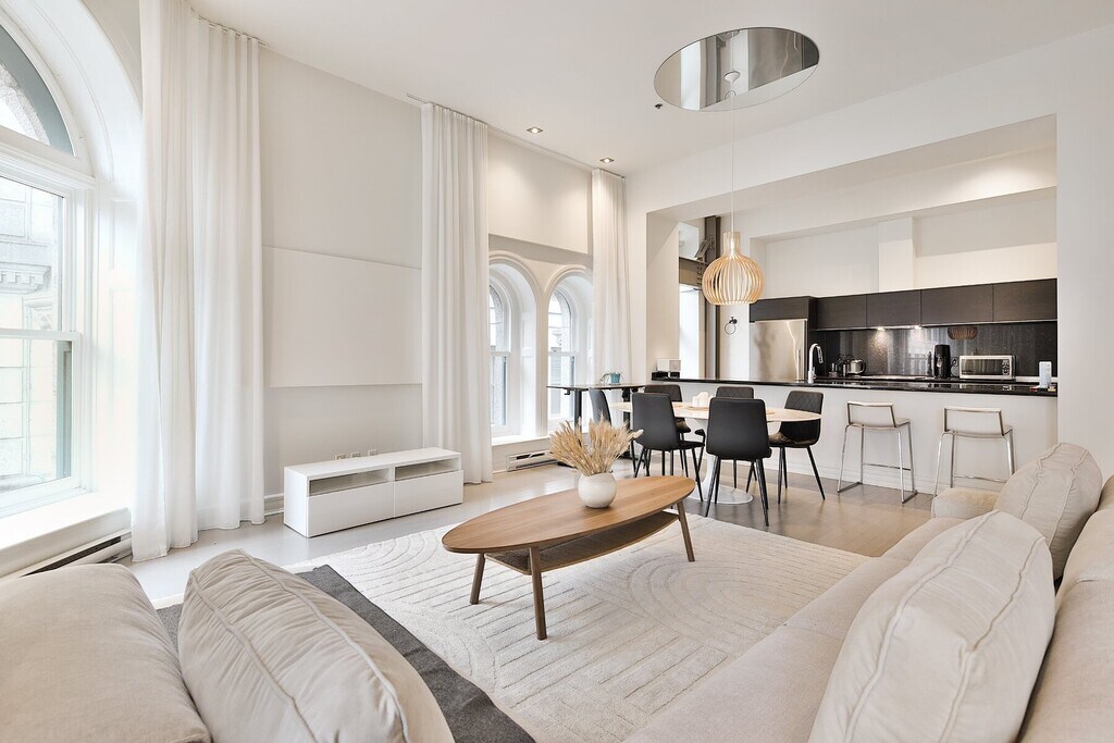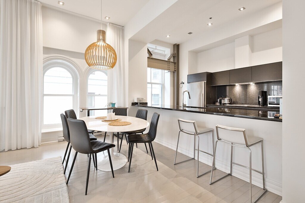 Stunning corner unit with impressive ceiling height. This fully furnished apartment, located in the heart of Old Montreal, offers two bedrooms and two full bathrooms. Features include light engineered hardwood floors, arched windows, a large black quartz countertop, and luxurious design. The unit also offers ample storage, including a private storage space in the basement. A clinic and pharmacy are located on the building's ground floor.
