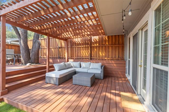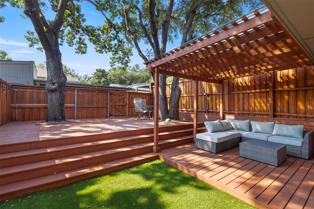 FULLY FURNISHED beautifully updated condo, perfectly situated in the prestigious Preston Hollow neighborhood in the heart of Dallas. Renovated from top to bottom in 2022, this stylish 3-bedroom, 2.5-bath home blends sleek design with everyday comfort. The spacious main living area is filled with natural light, highlighting modern finishes and original contemporary art. The open floor plan is ideal for both relaxing evenings and lively gatherings. The fully equipped chef-inspired kitchen features elegant quartz countertops, stainless steel appliances, and ample cabinetry, making meal prep both easy and enjoyable. Upstairs, unwind in the serene primary suite complete with a walk-in closet, en-suite bathroom, and a private balcony overlooking the backyard. Two additional well-sized bedrooms share a beautifully updated full bath, while a convenient half bath downstairs is perfect for guests. Step outside into your own private oasis: full redwood decking, a stylish pergola, and low-maintenance turf—perfect for year-round outdoor enjoyment. Located just minutes from I-75 and the Dallas North Tollway, you’ll enjoy quick access to premier shopping, dining, and entertainment. Fully stocked with brand new linens, towels and everything you could need.
