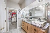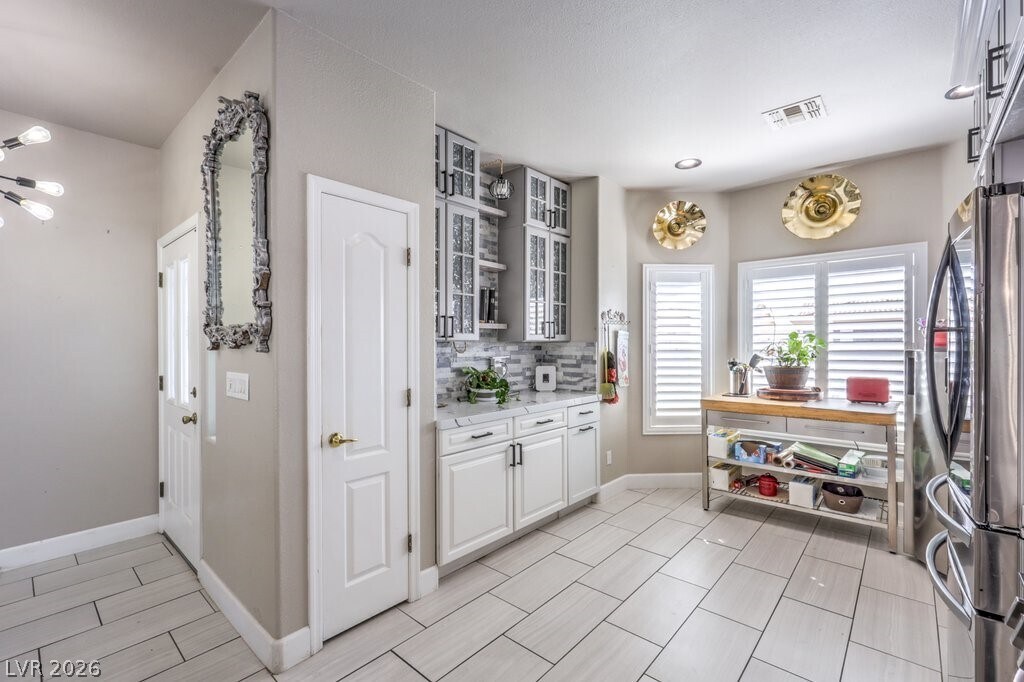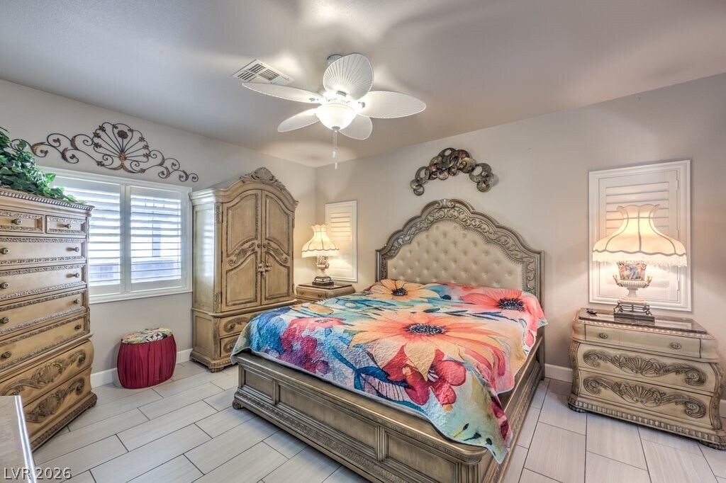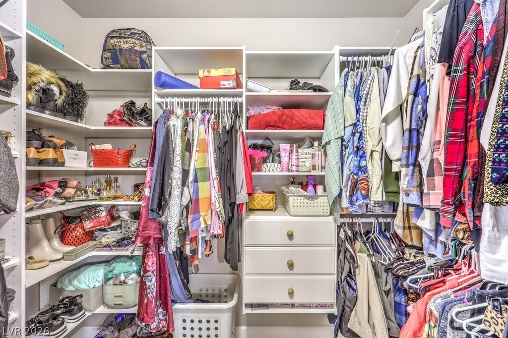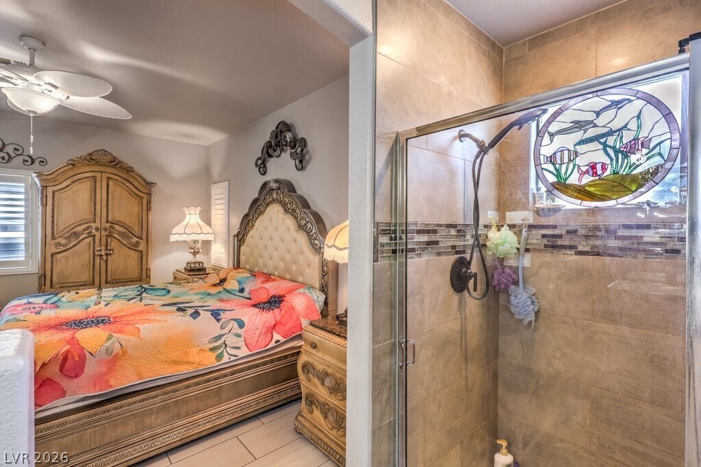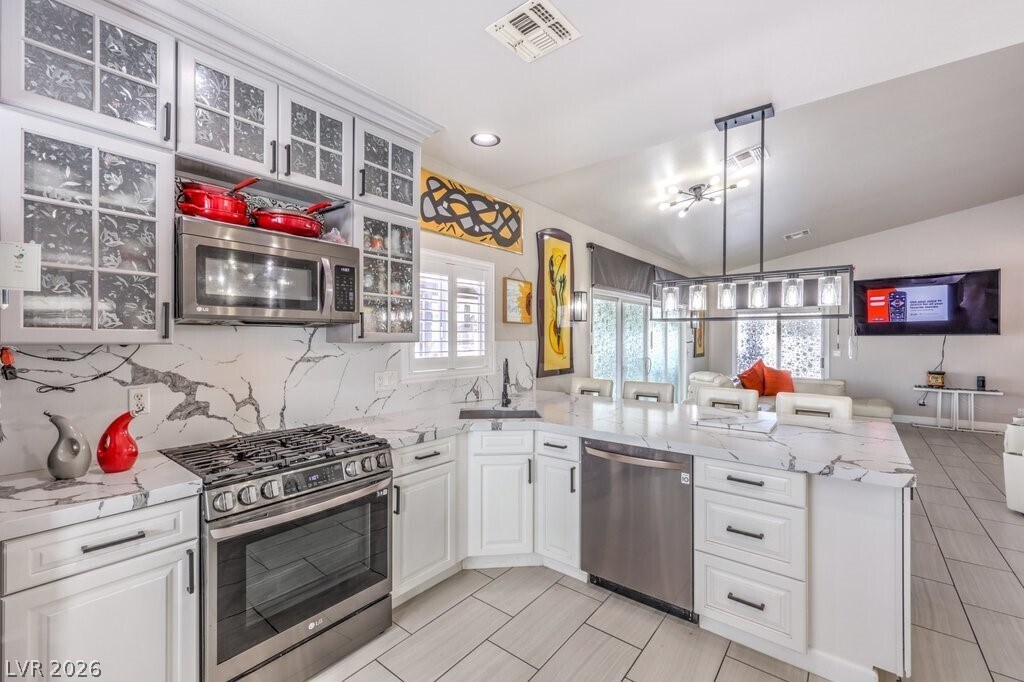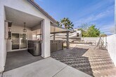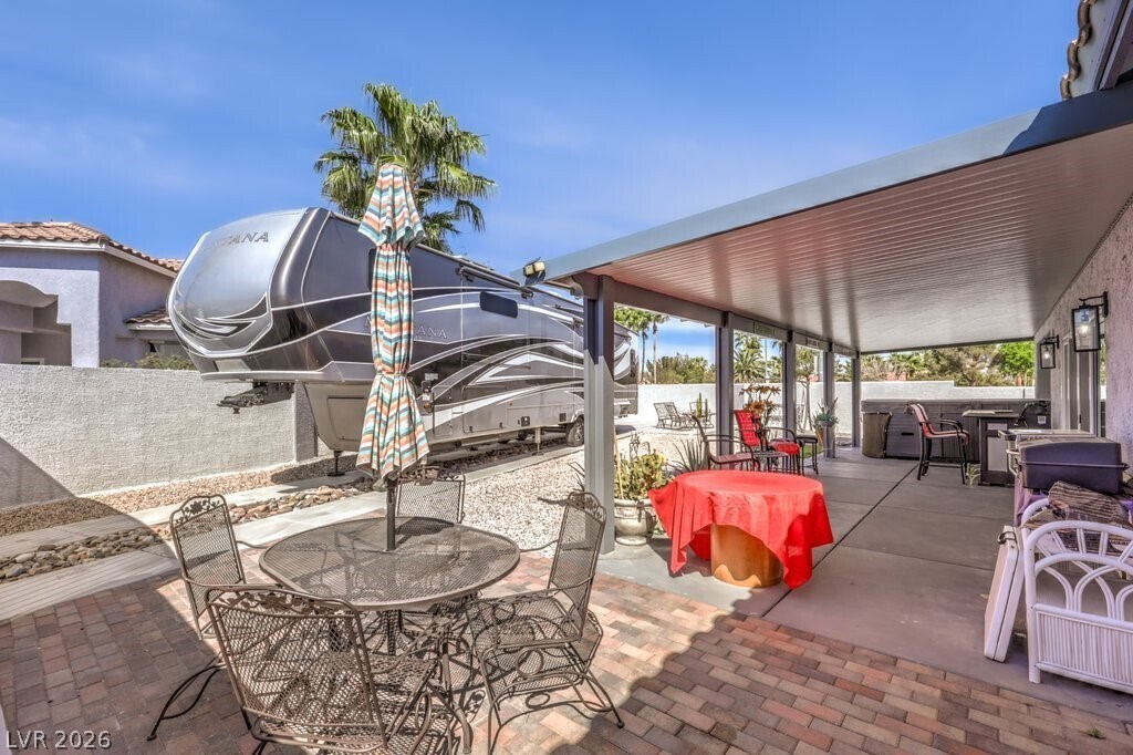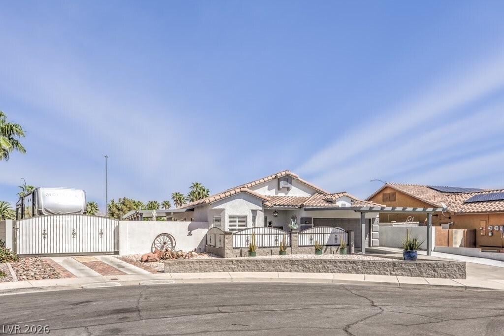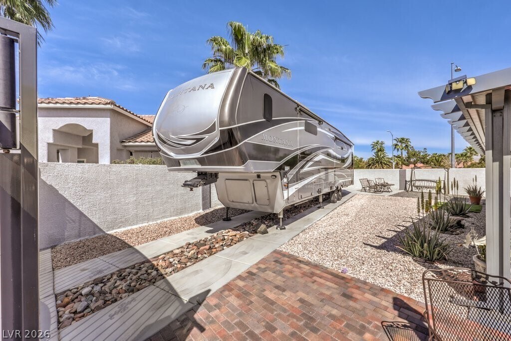 Beautifully upgraded home located on a spacious cul-de-sac lot in NW Las Vegas with exceptional parking and functionality. Features include a private iron-enclosed front courtyard, extensive concrete flatwork surrounding the property, and a large RV gate with the ability to accommodate up to 55–60 feet of RV or trailer parking. The backyard is fully enclosed with stucco walls and includes an oversized covered patio and storage shed. Interior offers 3 bedrooms and 2 baths with 12x24 tile flooring throughout, fresh interior and exterior paint, and white shutters on all windows. Upgraded kitchen with new cabinets and all appliances included. Living room features custom sliding doors for indoor-outdoor living. Additional highlights include a 2-car garage with epoxy floors and cabinets, extended driveway, covered carport, security doors, and side yard access. Move-in ready with numerous upgrades throughout.