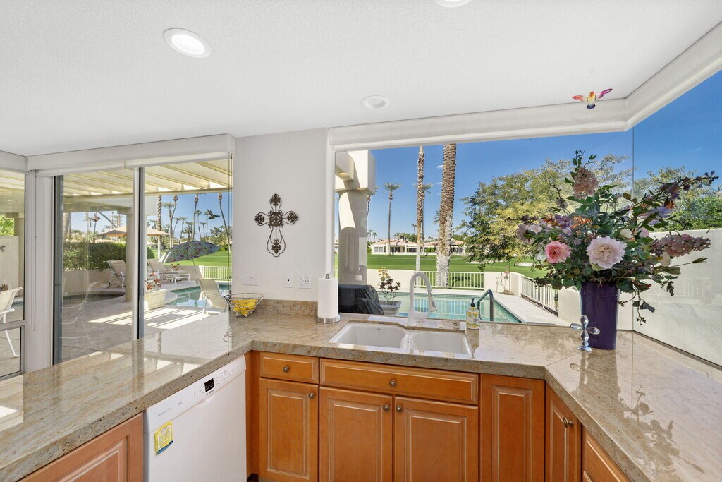 Leased Nov.. - March 2026.Gorgeous Fairway,Lake and Mountain Views are yours from this beautifully maintained Desert Horizons Pool home. As you enter the gated courtyard you are welcomed into this ever popular Troon floor plan offering 2 Master Suites and a Home Office. An open floor plan perfect for entertaining and lots of natural light from the walls of windows that overlook the Pool and Fairway. Features; Tile and Wood flooring throughout the home,ceiling fans in each room and plantation shutters. Living room has a cozy fireplace,Family Room has a Flat Screen TV with an adjacent Wet Bar with stools and a bar refrigerator. Dining area for 6. The Chef's Kitchen has rich wood Cabinetry,updated Appliances,harmonizing granite countertops,a wine cooler and a Breakfast Nook with a flat screen TV. Spacious Master Suite with spa-style bath,dual vanities,King bed with TV and a generously sized custom walk-in closet. 2nd Guest Master Suite features a King bed with TV and has its own private patio,en-suite bath and walk-in closet. The Home Office offers a custom built-in Desk and cabinets with views out to the Courtyard. An additional 3/4 bath,spacious laundry room and a 3 car garage complete the home. What a better way to entertain on your back Patio enjoying the beautiful sunsets and your own private sparking Pool and Spa,awnings and BBQ or watch the golfers go by on the beautiful #17 Fairway at this premiere Indian Wells location.