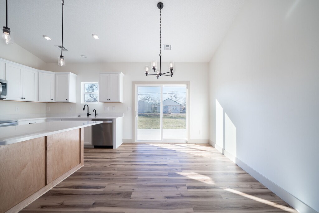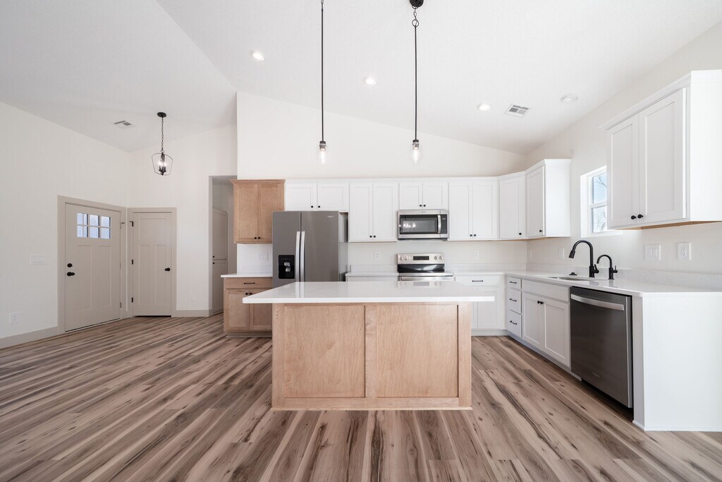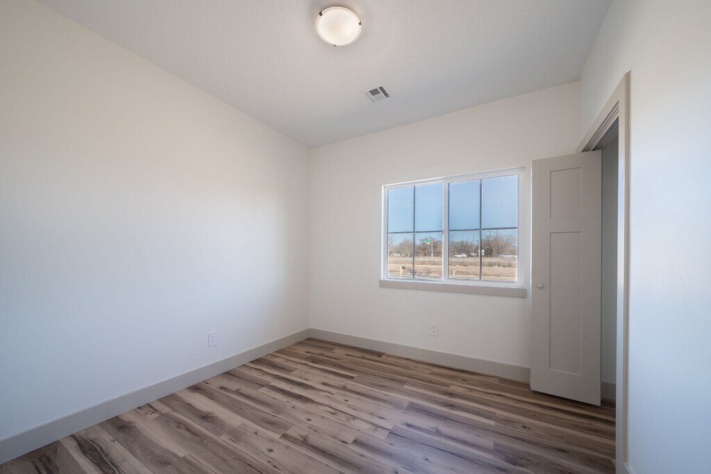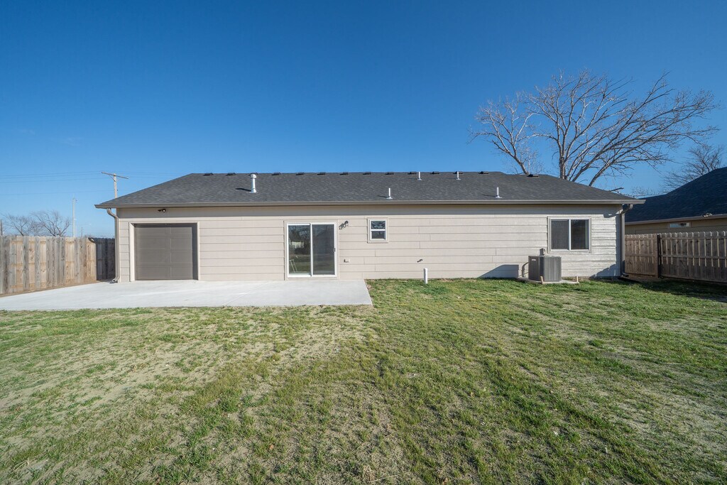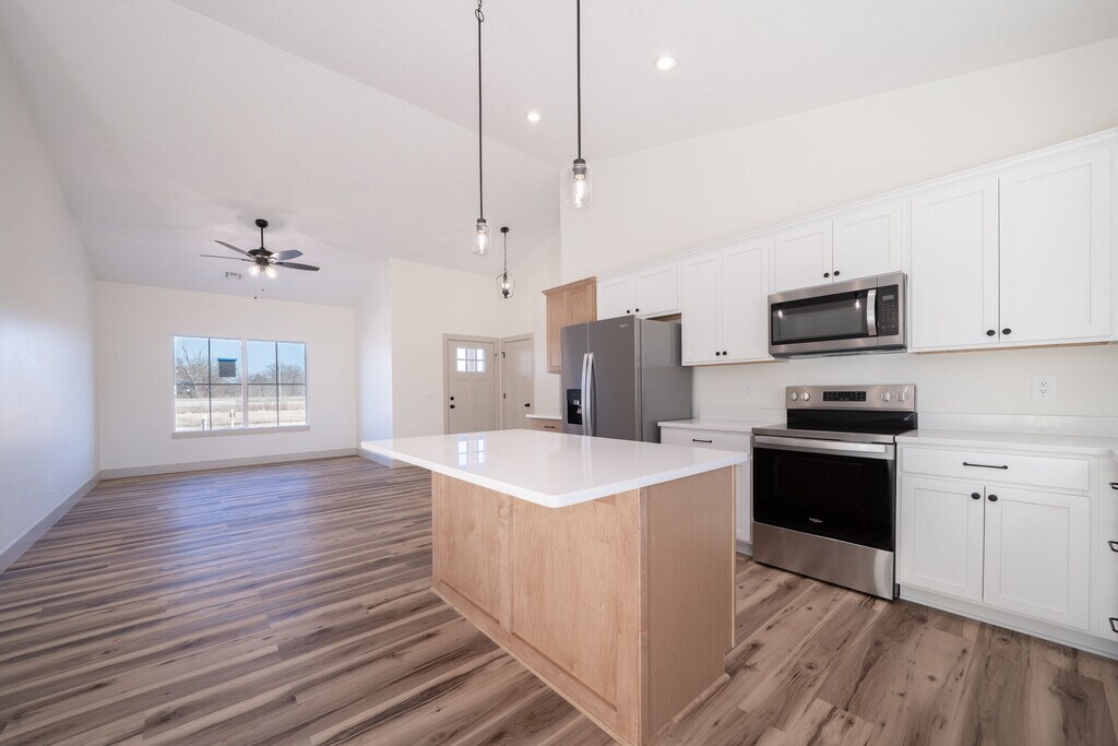 Home features a near zero-step entry for easy access. Brand-new ranch-style home in west Wichita! This 3-bedroom, 2-bath home features vaulted ceilings in the family room and primary bedroom, a large walk-in closet, a huge kitchen, two-car garage, and a spacious fenced yard. Excellent location with easy highway access.