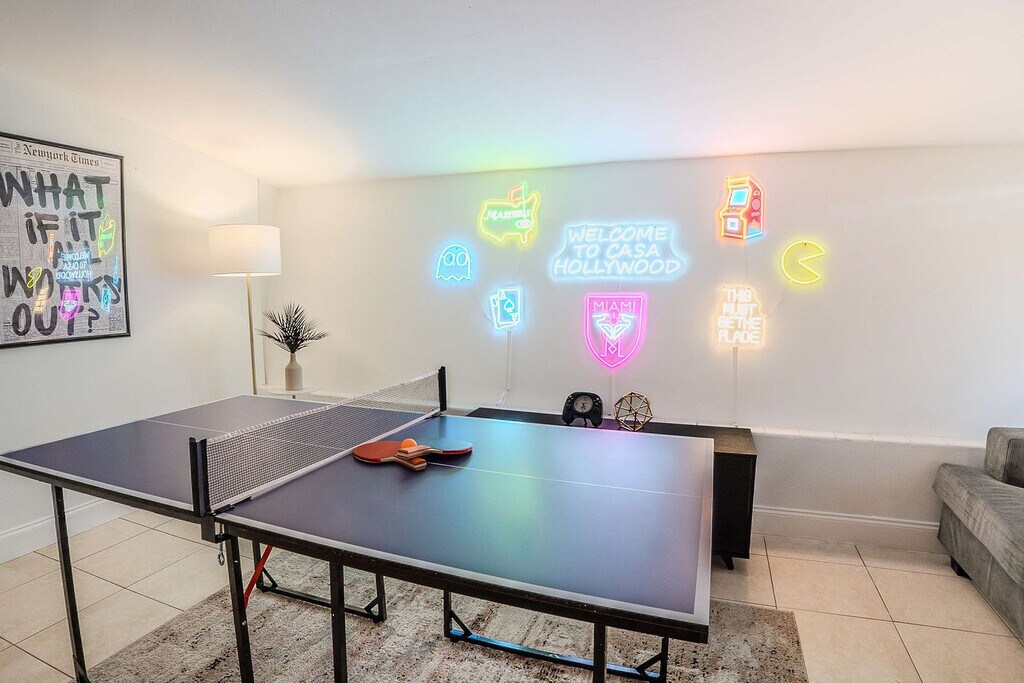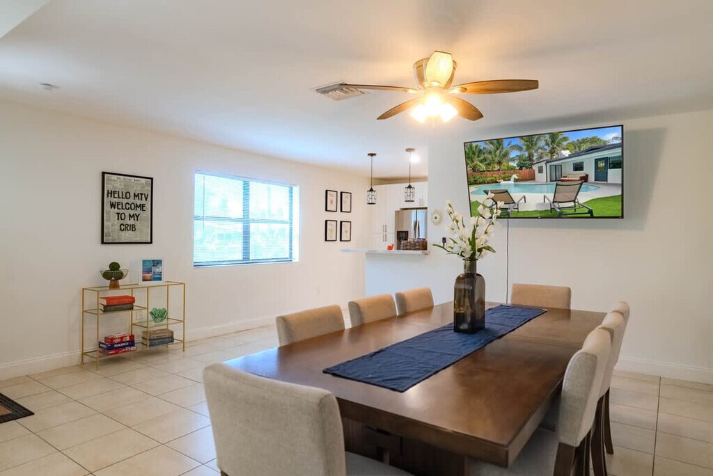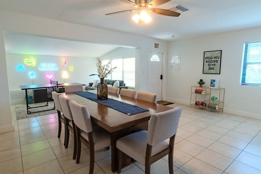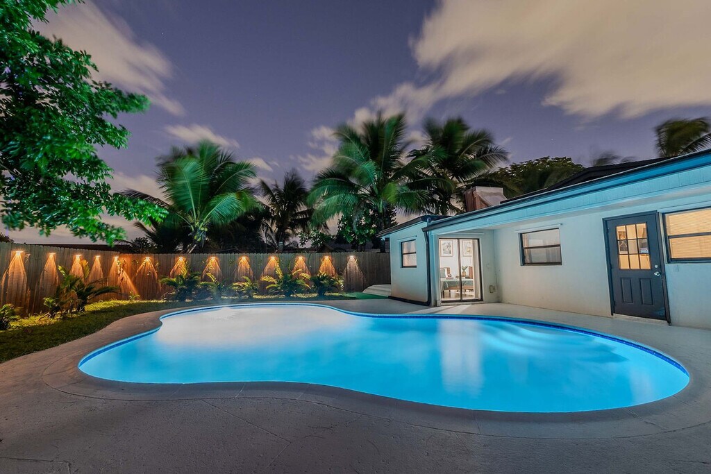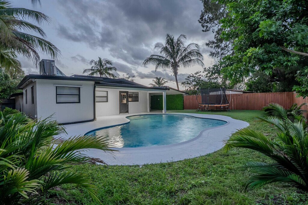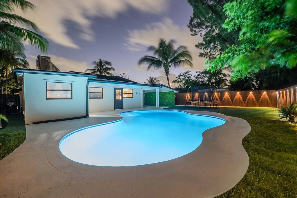 Feel at home in this spacious villa located in a quiet Miami neighborhood, offering ample room and amenities for large groups. This villa features an open-plan living area with a gourmet kitchen, large bedrooms with smart TVs, and a huge master suite. Enjoy a gorgeous yard with palms, a pool, and a covered patio with a dining area and outdoor lounge. The chef-friendly kitchen is fully equipped with modern stainless steel appliances, quality dinnerware, cookware, and utensils, as well as a coffee station, dishwasher, microwave, and a large fridge/freezer. Entertainment options include a smart TV, high-speed Wi-Fi, and board games. Enjoy the lush resort-style yard with a beautifully landscaped pool area, a gas grill, a trampoline, night lights, a dining table with chairs, an outdoor lounge, and sun loungers. The villa is conveniently located just minutes from the popular Hard Rock Casino and restaurants, 8 minutes by car to the Seminole Hard Rock Casino, 25 minutes to Hollywood Beach & Boardwalk, 15 minutes to the Fort Lauderdale-Hollywood International Airport and Hard Rock Stadium, and 30 minutes to Tidal Cove Waterpark. Getting around is easy with free parking in the home’s driveway for up to 4 cars, and ride-sharing services are readily available. When in Hollywood, take the electric Sun Shuttle service. Quiet time starts at 10 pm out of respect for the neighbors. Smoking is allowed outside only. Evidence of indoor smoking will incur a $650 odor removal fee. No street and no grass parking at anytime. No events or parties are allowed unless approved by hosts. No glass around the pool, and children must be supervised. No illegal activity or substances are permitted. Check-in is at 4 pm and check-out is at 10 am. Guests agree to keep premises in good condition and be financially responsible for any items missing or broken. [SI]