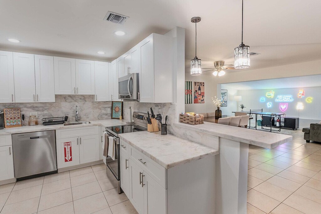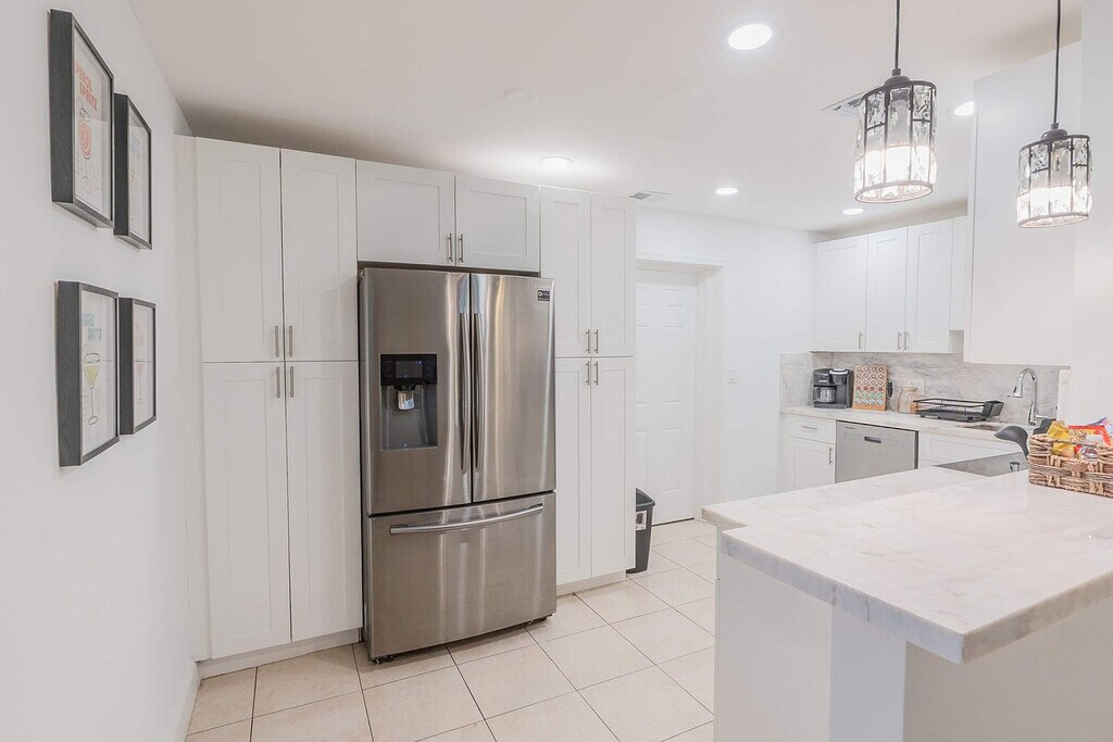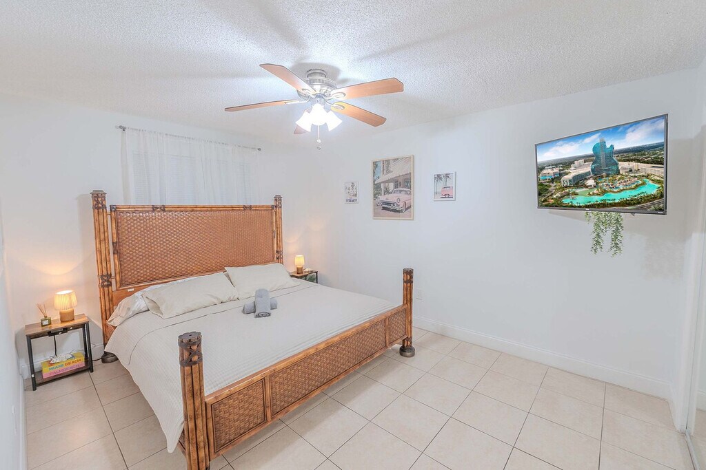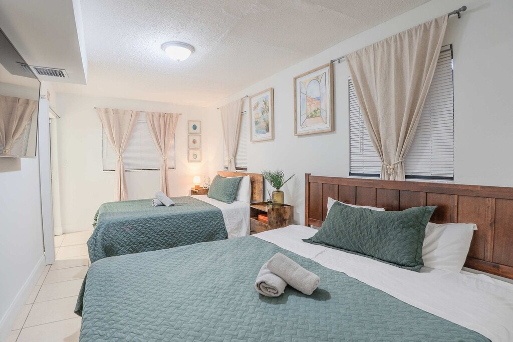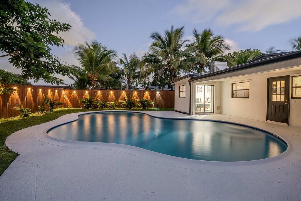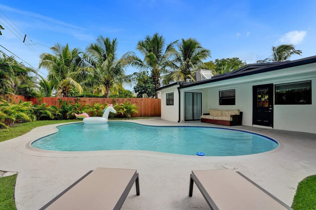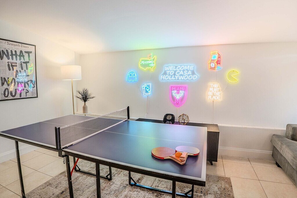 Feel at home in this spacious villa located in a quiet Miami neighborhood, offering ample room and amenities for large groups. This villa features an open-plan living area with a gourmet kitchen, large bedrooms with smart TVs, and a huge master suite. Enjoy a gorgeous yard with palms, a pool, and a covered patio with a dining area and outdoor lounge. The chef-friendly kitchen is fully equipped with modern stainless steel appliances, quality dinnerware, cookware, and utensils, as well as a coffee station, dishwasher, microwave, and a large fridge/freezer. Entertainment options include a smart TV, high-speed Wi-Fi, and board games. Enjoy the lush resort-style yard with a beautifully landscaped pool area, a gas grill, a trampoline, night lights, a dining table with chairs, an outdoor lounge, and sun loungers. The villa is conveniently located just minutes from the popular Hard Rock Casino and restaurants, 8 minutes by car to the Seminole Hard Rock Casino, 25 minutes to Hollywood Beach & Boardwalk, 15 minutes to the Fort Lauderdale-Hollywood International Airport and Hard Rock Stadium, and 30 minutes to Tidal Cove Waterpark. Getting around is easy with free parking in the home’s driveway for up to 4 cars, and ride-sharing services are readily available. When in Hollywood, take the electric Sun Shuttle service. Quiet time starts at 10 pm out of respect for the neighbors. Smoking is allowed outside only. Evidence of indoor smoking will incur a $650 odor removal fee. No street and no grass parking at anytime. No events or parties are allowed unless approved by hosts. No glass around the pool, and children must be supervised. No illegal activity or substances are permitted. Check-in is at 4 pm and check-out is at 10 am. Guests agree to keep premises in good condition and be financially responsible for any items missing or broken. [SI]