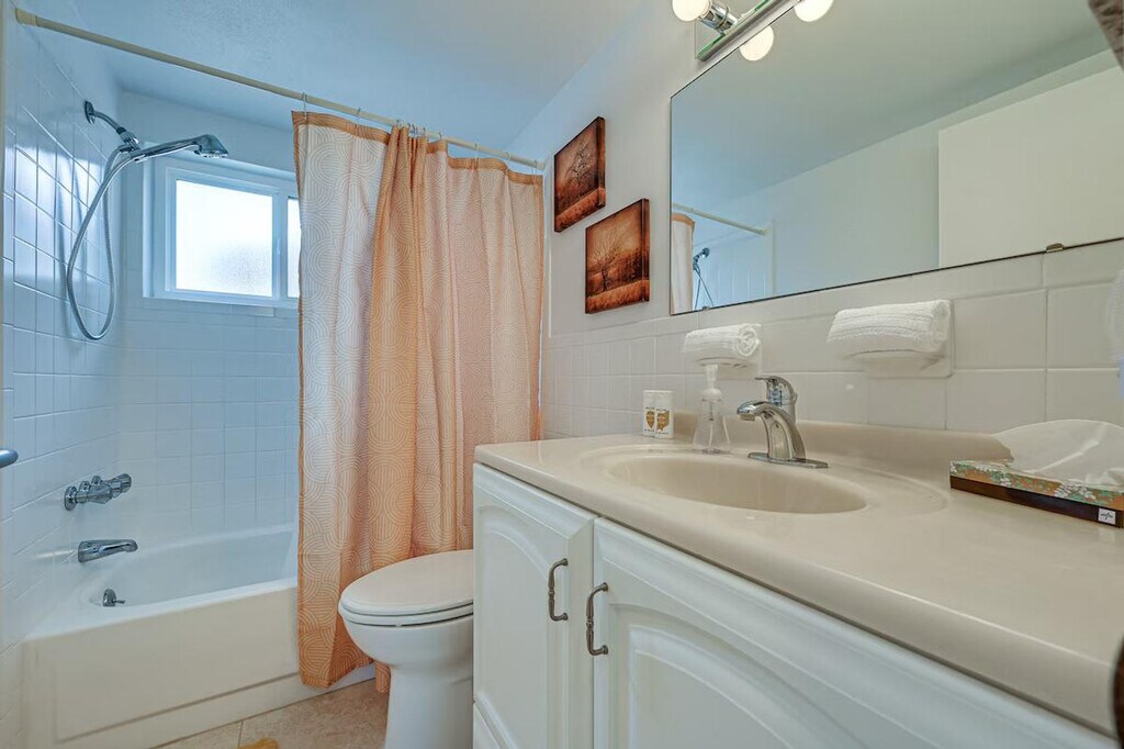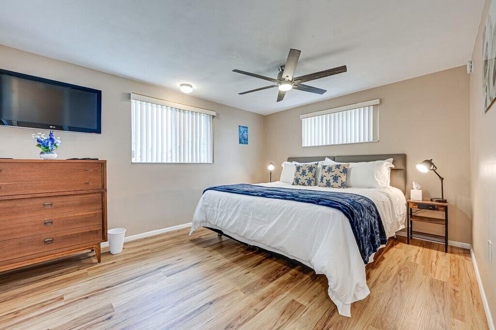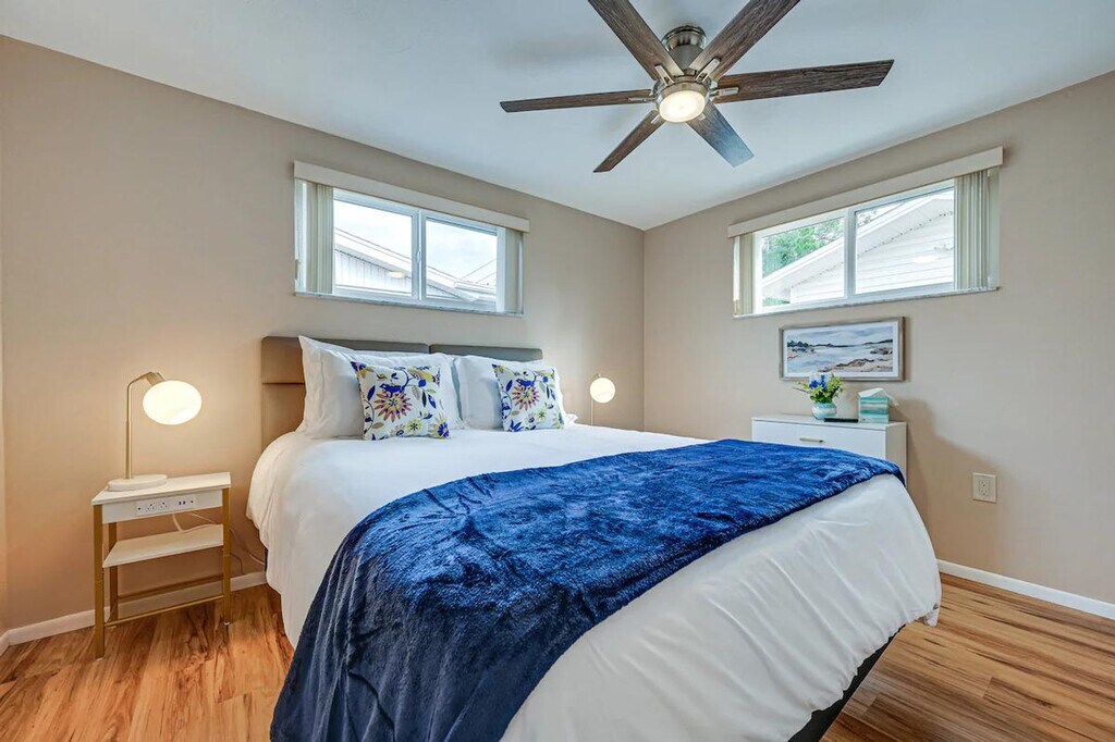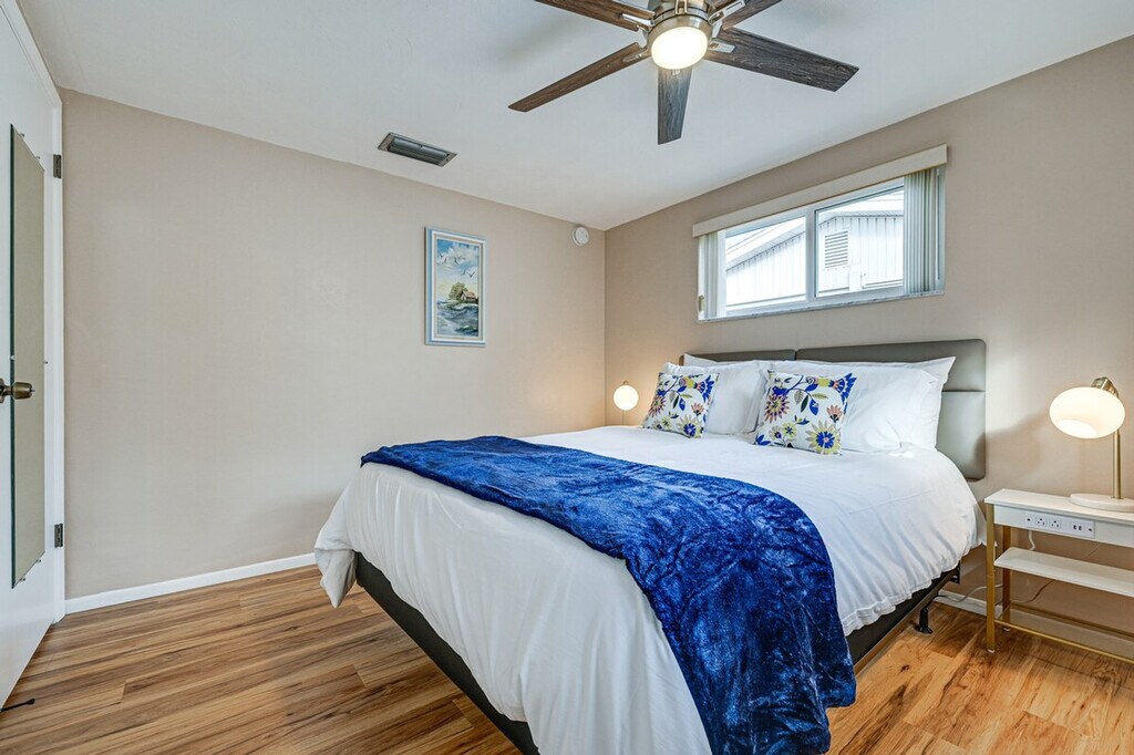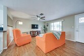 Feel at home in this Port Richey vacation rental, a single-story home that requires one step to enter. This 2-bedroom, 2-bath home is moments away from the Gulf Coast. This home features Smart TVs with streaming, free Wi-Fi, and central air conditioning. The kitchen is equipped with a dishwasher, Cuisinart coffee maker, toaster, refrigerator, stove and oven, microwave, dishware and flatware, trash bags and paper towels, and cooking basics. Enjoy the dining table, ceiling fans, board games, screened porch, backyard, and gas grill. A washer and dryer, detergent, towels and linens, complimentary toiletries, an iron and board, and a hair dryer are also provided. You'll find yourself just a half-mile from restaurants, shopping, and entertainment, with Nick’s Park Boat Ramp and Robert K Rees Memorial Park both within 8 miles. Smoking, pets, events, parties, and large gatherings are not allowed. The garage is available for property access, but not for parking. Guests must be at least 30 years old to book. This property features 5 exterior security cameras that record video and sound when activated by motion. Camera 1 is on the east side of the home facing the garage door, camera 2 is on the west side of the home facing the side of the home, camera 3 is above the back door facing the back outdoor entry, camera 4 is above the front door facing the front outdoor entry, and camera 5 is above the garage door facing the driveway and street. The cameras do not look into any interior spaces. A photo ID may be required upon check-in. [SI]
