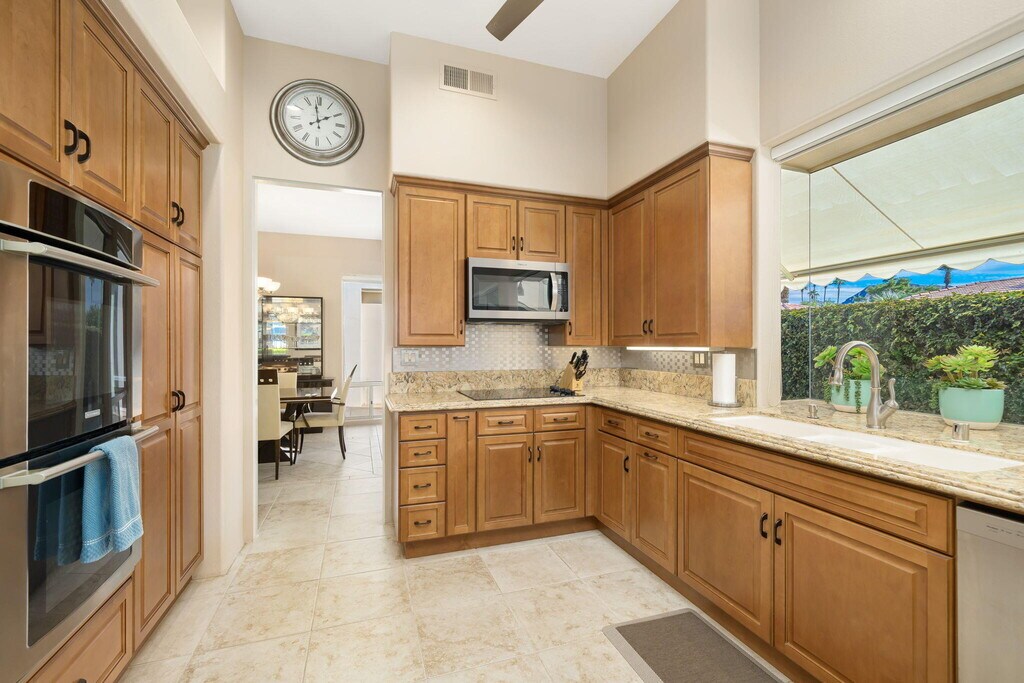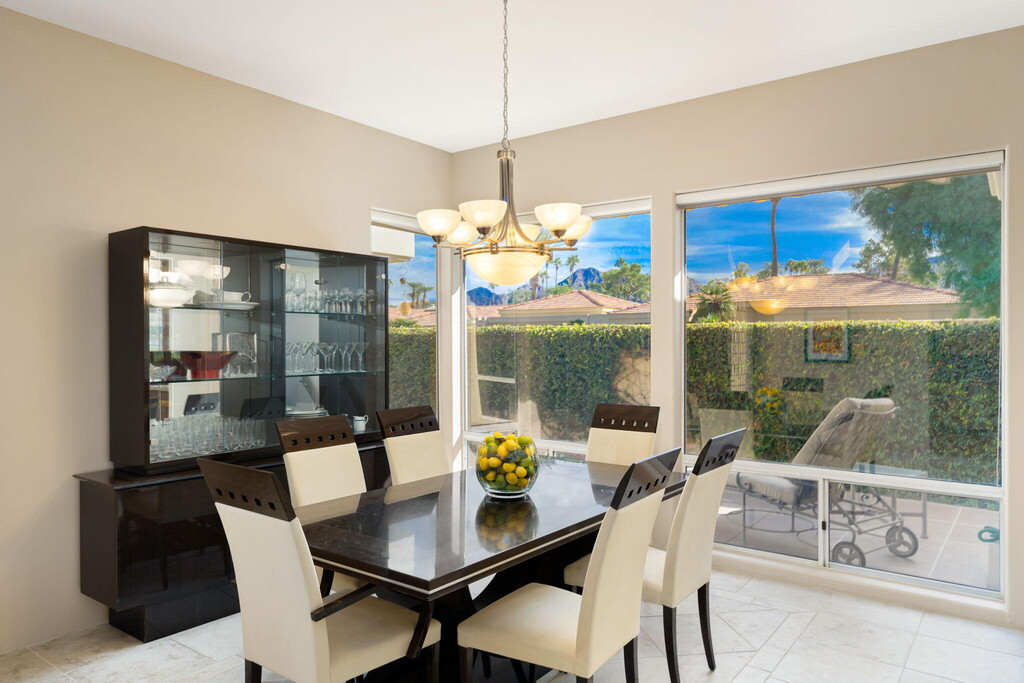 Leased through 2026. Spectacular Mountain,Fairway and Lake Views are yours from this former Turnberry model home. As you enter the private courtyard you're welcomed into this home overlooking the Lake and down the 17th Fairway to the Mountain Vistas. 3 Bedrooms (one is a detached casita),3 Bathrooms. The Chefs Kitchen has custom cabinets,Granite countertops and newer appliances. There is an adjacent breakfast Nook which opens to the family room. Family Room has a large flat Screen TV. Spacious Master Bedroom Suite with King Bed has a marble shower,spa tub and double vanity. 2nd Guest Room has a Queen bed and adjacent full bath. Casita is the 3rd Guest Room with Queen Bed. Enjoy the Sunsets from the Patio with your own private Spa. Multiple awnings. This corner location has South Views from the Kitchen,Dining Room & breakfast Nook~ all at this premiere Indian Wells Location.