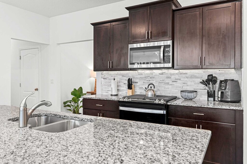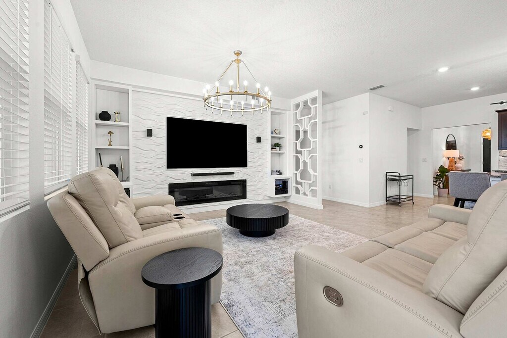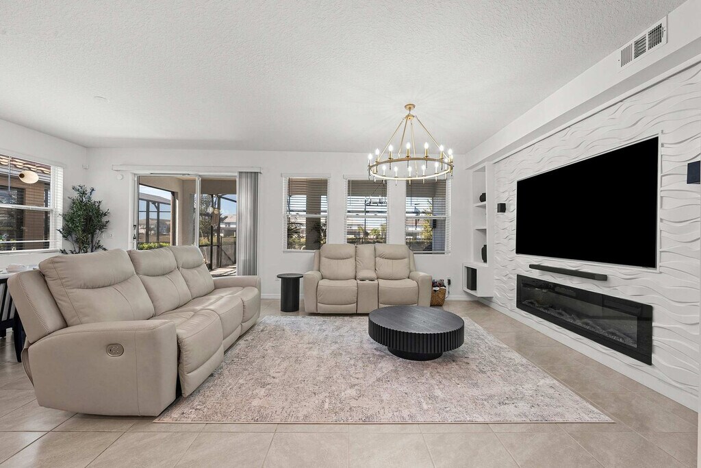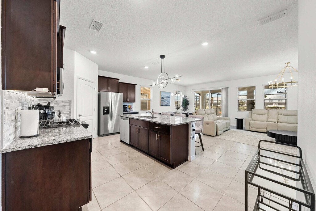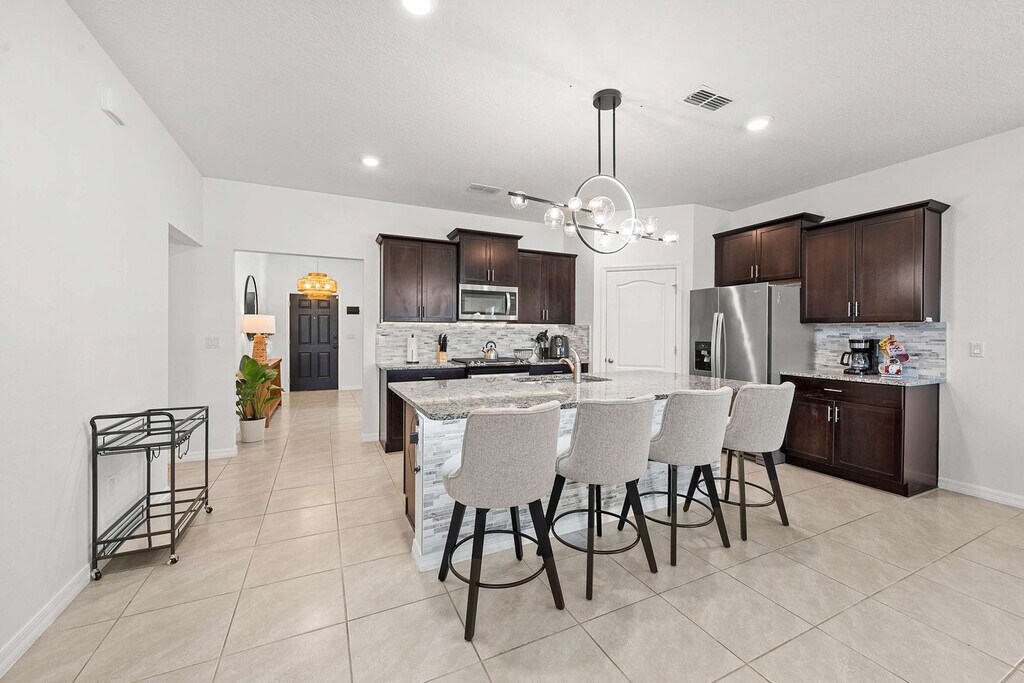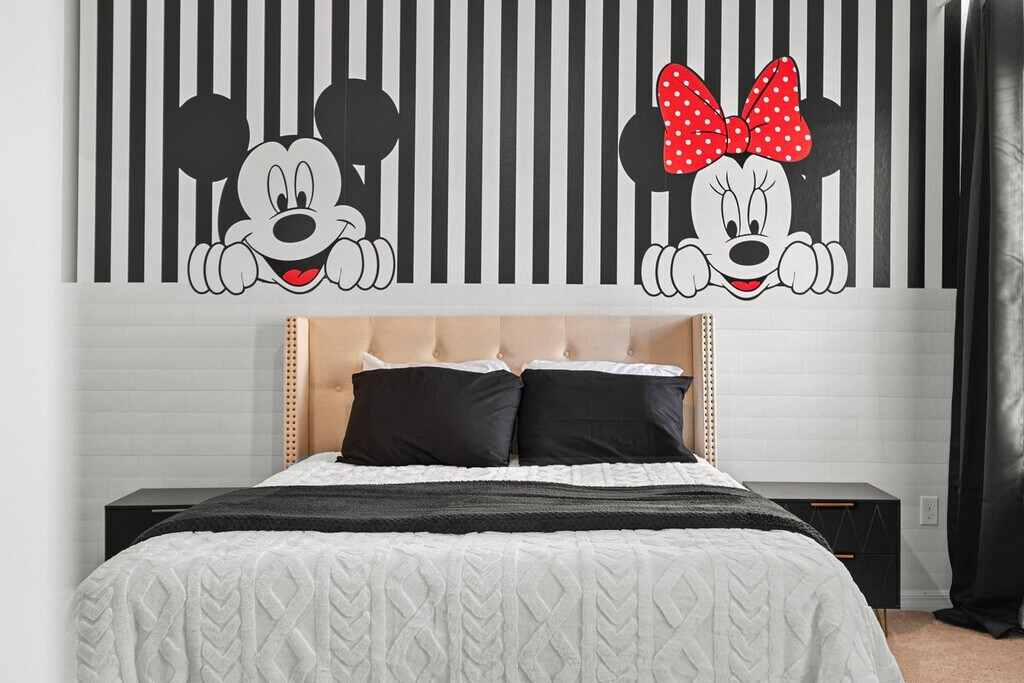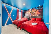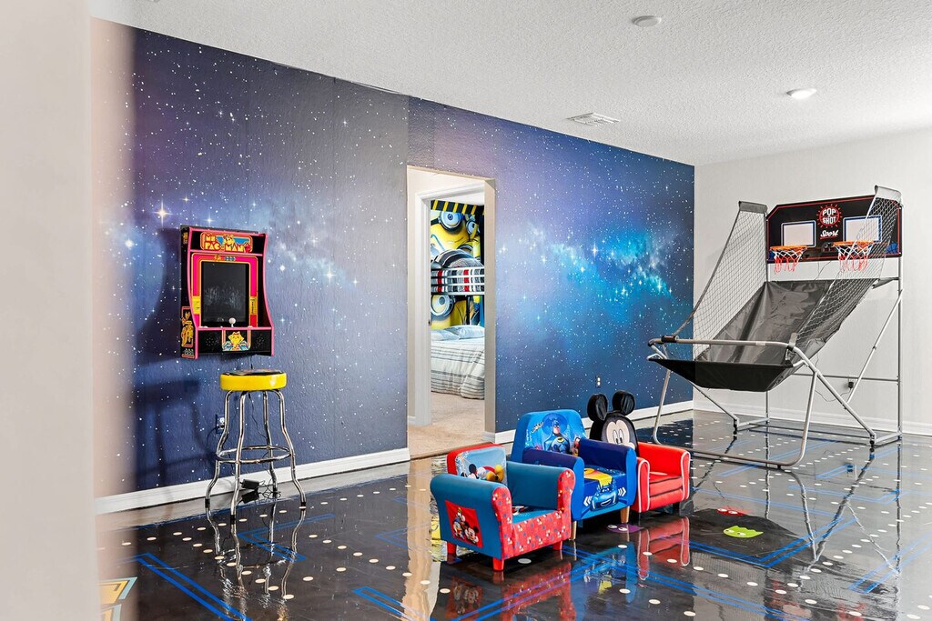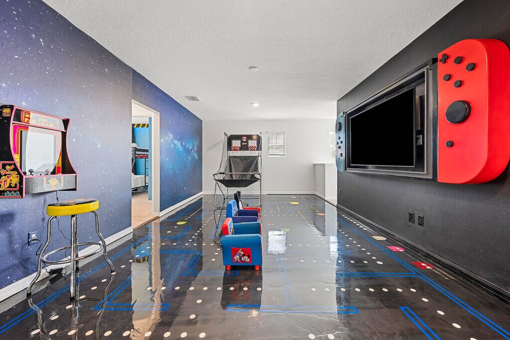 Enjoy space, comfort, and style in this chic 6-bedroom home at Solterra Resort. Perfect for up to 19 guests, it's the ideal spot for a fun and relaxing Orlando getaway. Feel at home in this spacious home designed for comfort, style, and fun. This home features an open-concept living area with a beautifully furnished lounge that flows into a fully equipped kitchen and dining space. The Pac-Man–themed game room includes basketball and video games. The four themed bedrooms—Princess, Mickey, Minions, and Avengers—bring imagination to life. For your convenience, the home includes an in-home laundry room, free Wi-Fi, and a welcome kit with essential bathroom and kitchen items (no replenishment provided). Optional pool heating and BBQ grill services are available for an additional fee. Clubhouse amenities are available to guests for an additional charge during their stay. The clubhouse administration may also charge optional fees for certain activities such as special events, seasonal programs, or rental of sporting equipment. A resort fee (Leisure Patron Amenity Access Fee) is payable directly at the clubhouse front desk upon check-in: 1–12 guests: $35.00 and 13+ guests: $45.00. This is a one-time fee per house per reservation. Located in the sought-after Solterra Resort, you’ll also enjoy access to amazing resort amenities, including a resort-style pool, lazy river, fitness center, and tennis courts. Solterra Resort is a premier vacation community located near Orlando, Florida, just minutes from world-famous attractions, top golf courses, and shopping destinations. With easy access to I-4 and beautiful natural surroundings, it’s the perfect location to enjoy comfort, convenience, and Florida sunshine. The resort features an impressive 6,700 sq ft clubhouse with an internet room, fitness center, and large gathering area. Outdoors, guests can enjoy a resort-style pool with waterfall and slide, lazy river, beach-entry area, picnic spots, a children’s playground, and a tennis court. Quiet hours are between 10:00 PM and 8:00 AM. [SI]