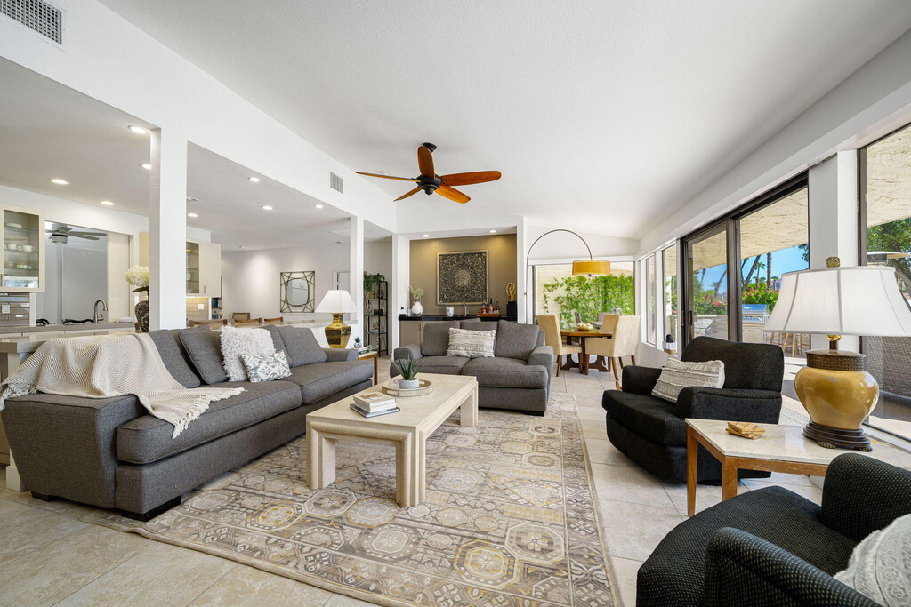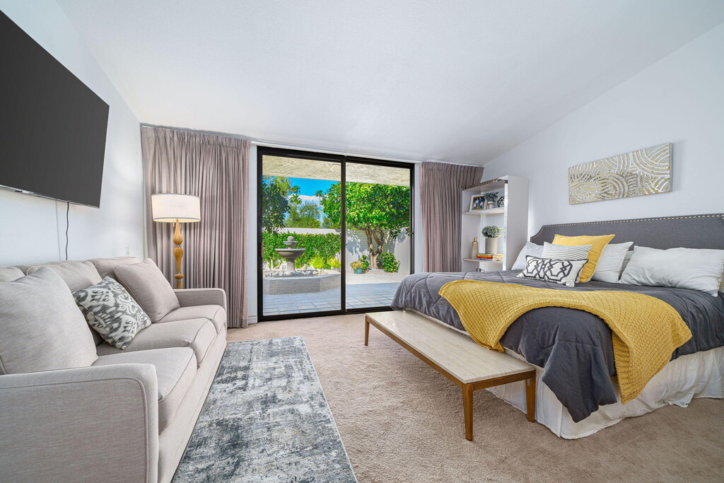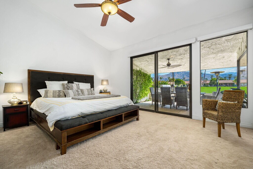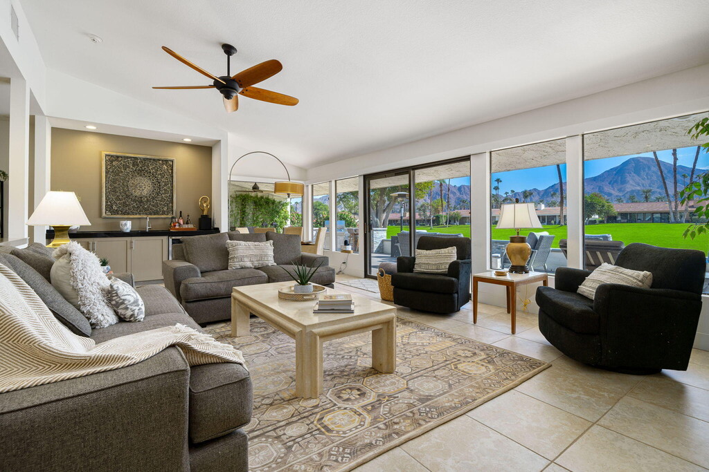 Available Jan. 4th 2026. Spectacular South Mountain & Fairway Views are yours from this Gorgeous 3 Bedroom- 3 Bath Furnished home. The private Courtyard with flowing Fountain welcomes you into this tastefully appointed home perfect for Entertaining with a spacious Open Living Concept. Architectural details include the Entry Foyer,pristine Tile floors,Living Room with Fireplace and TV,Wet Bar with Wine Frig. An upgraded Gourmet Kitchen with an over-sized Island with seating for 4,Quartz counter finishes,Stainless Steel Appliances,warm Cabinetry and Backsplash. Breakfast Nook for 4,Dining area for 6 and Den enhanced by wood beam ceilings,TV for relaxing. Luxurious Master Suite w/ a King Bed,TV and its own Patio access,large Shower and custom Walk-in Closet. Spacious 2nd & 3rd Guest Rooms offer updated en-suite baths & sliders out to their own patios,both offer Queen-size Beds. Take in the breathtaking sunsets while savoring the incredible views of Mt. Eisenhower from your outdoor patio,complete with a gas grill and dining table for six. The community pool is just steps away,offering the perfect setting for relaxation and fun.