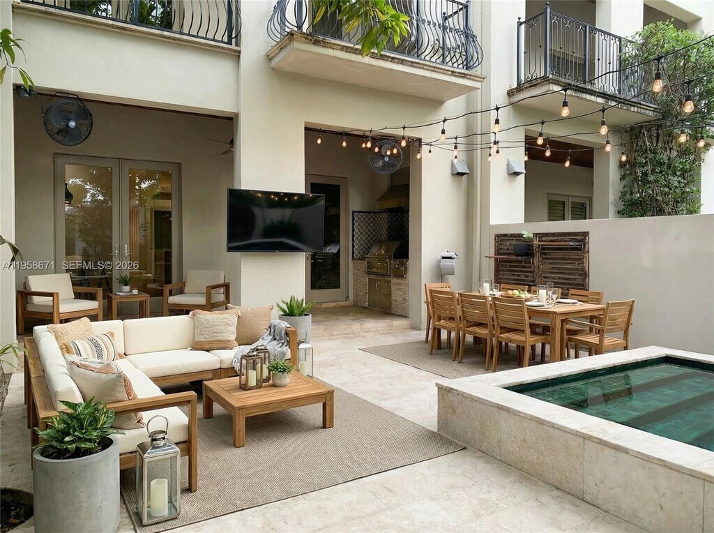 Elegant and desirable three-story residence at gated Townhomes at Oak Lane, ideally located in the heart of South Miami in High Pines. It combines luxury and convenience, featuring a private elevator, marble and wood floors, and impact windows. The open living area centers around a stylish wet bar, with ice maker, beer tap and wine cooler—perfect for entertaining—and a modern kitchen outfitted with gas stove, Wolf and Sub-Zero appliances. The family room opens to an inviting patio with an outdoor kitchen, cocktail pool with relaxing waterfall. Covered private and secure parking for four vehicles, abundant storage, laundry, and a full-house generator add everyday comfort. The large primary suite includes a sitting area, large closets, and an expansive private balcony retreat. Extra space with a full bath can be an office, gym or guest bedroom. Walk to South Miami’s favorite restaurants, shops, and the University of Miami; just minutes from Coral Gables, Coconut Grove, and Brickell. Refined urban living at its best near top public and private schools. Easy to show. MLS # A11958671