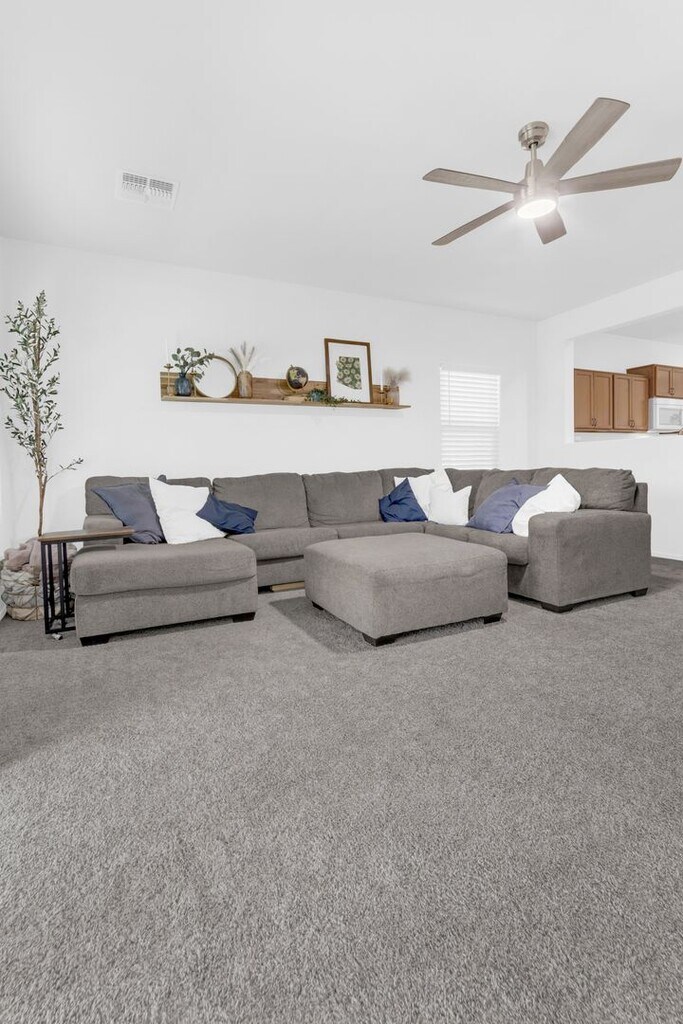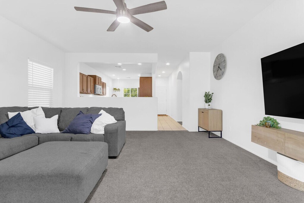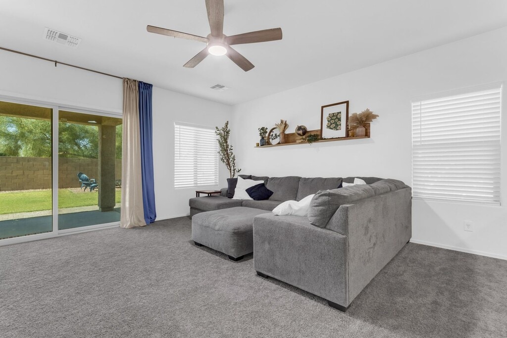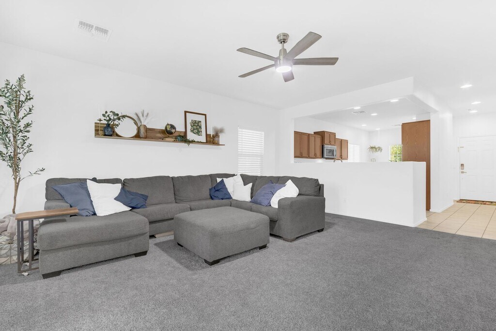 Step into this stunning single-level rental in the highly sought-after Anthem at Merrill Ranch! This home offers a desirable north/south orientation, no rear neighbors, and owned solar panels for significant energy savings. The open-concept kitchen flows seamlessly into the living area and features a pantry for extra storage plus plenty of counter space, perfect for cooking and entertaining. Enjoy the low-maintenance desert landscaping in both the front and backyard, along with a covered patio ideal for relaxing outdoors. Ceiling fans in every bedroom and the living room help keep cool air circulating, enhancing the comfort of your air conditioning during the summer months. As part of the HOA, you'll have access to a community pool and fitness center,