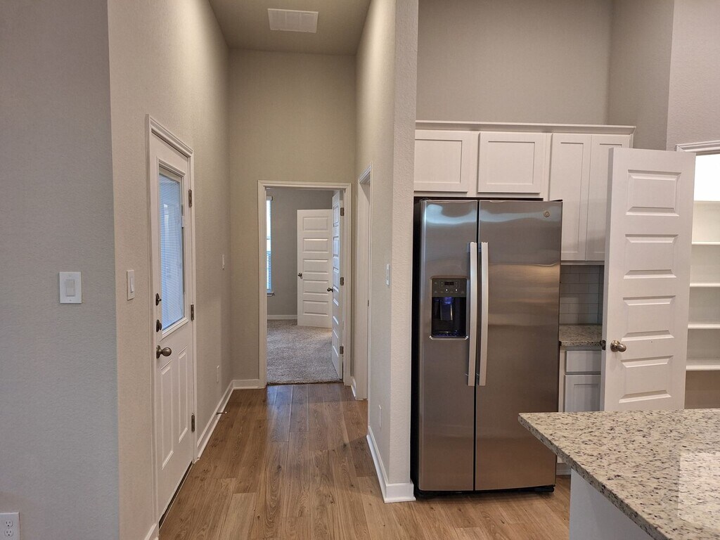 Be the first, to live and enjoy this exquisite three bed/two bath single-family home, in Buda. The 1,486 sf. one story home, maximizes every inch of space, extra closet space, family friendly drop zone, for coats, sports equipment, backpacks and shoes. No more messy entry. The 11' ceilings make this space feel huge and the light color walls, floors, cabinets, and granite counters really make it such a welcoming space. All kitchen appliances and the refrigerator with ice dispenser included. You will also enjoy the pantry with plenty of storage to organize your food items. The primary bedroom is your personal oasis. The coffered ceilings, fan and windows look-out to the big back hard with privacy a dark stained fence. The ensuite has granite counters, double vanity and plenty of drawers and cabinet space. The water closet has additional cabinets above the commode. Enjoy the incredible stand alone shower with glass doors that really bring home the luxury feel. Now incase that is not enough, the HUGE walk-in closet will definitely seal the deal! On the other side of the home you will find two spacious bedrooms and another full bath with tub/shower combo and granite counters. Outside you can take advantage of the covered patio and large backyard. This home awaits you; so schedule a tour, do not miss out on this one!