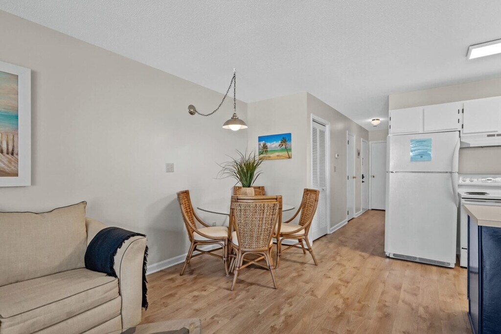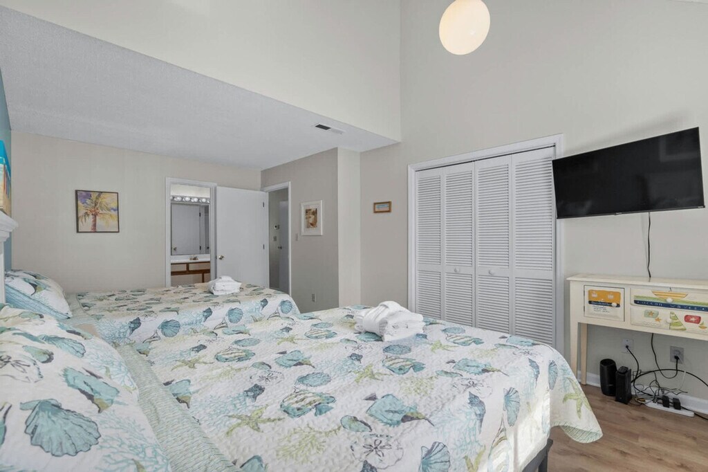Feel at home in Herold's Hideaway, a recently remodeled 1-bedroom, 1.5-bath condo located in Golf Colony at Deerfield on the second floor. This property overlooks a beautiful pool deck with grilling areas and a hot tub. This apartment features a large bedroom with an en suite bath and lockout door off the hallway for extra privacy. There is also a half bath for guests. The fully equipped kitchen has all the appliances and supplies needed to cook gourmet meals. The bedroom and living room each have HD smart TVs (one Vizio and one Roku TV). A spacious patio overlooks the courtyard and beautiful pool deck/grilling areas. A washer and dryer are located in the utility closet on the patio. Linen service, including linens for all beds, bath towels, hand towels, and wash cloths, is available for an additional fee of $50 for your stay. Located in Surfside Beach, this apartment is close to the South Strand's greatest attractions, like the Murrells Inlet Marsh Walk, Myrtle Beach State Park, and Broadway at the Beach. Guests must be 25 years of age or older to reserve. Smoking and pets are not permitted. Routine pest control treatment is scheduled during your stay, typically occurring on the 3rd Thursday of even months. A fine may be applied if entry is refused to the pest control technician. [SI]