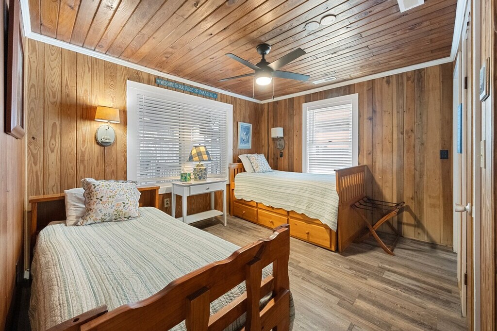 Nestled on the serene South End of Pawleys Island, South Carolina, Laughin Place invites you to escape to a world of smiles, laughter, and tranquility. This charming oceanfront and creekside haven promises to be your perfect getaway. It features seven bedrooms and accommodates up to sixteen guests, ensuring ample space for relaxation and enjoyment. Located on the south end of Pawleys Island, this property offers the unique advantage of being both oceanfront and having a private dock on the creek. This prime location allows for easy access to the beach and water activities, making it an ideal spot for those looking to explore the natural beauty of the area. [SI]
