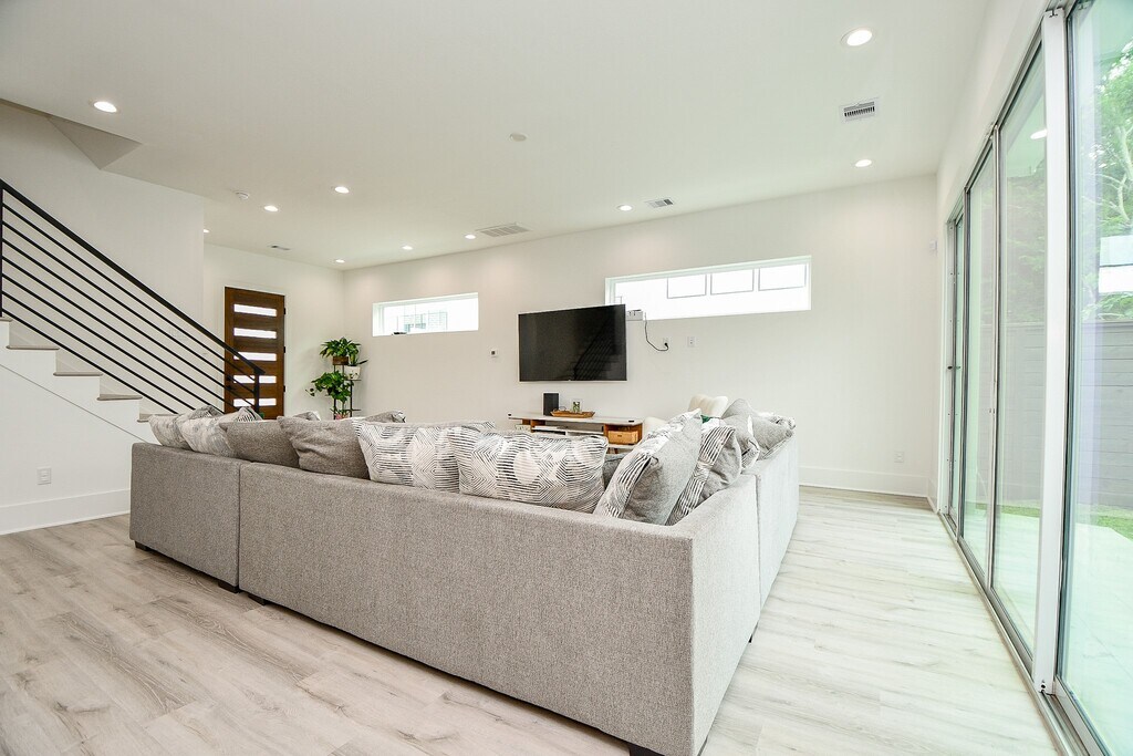 This open-concept design features 10' ceilings and white-plank luxury vinyl flooring throughout the home. The dine-in kitchen is equipped with stainless steel appliances,quartz countertops,European-style cabinetry and select plumbing fixtures. Sliding glass door opens to a private porch and yard with no back door neighbors. The expansive primary suite boasts large windows,dual vanities,a freestanding soaking tub,a glass-enclosed shower and a spacious walk-in closet with built ins. Two additional en-suite bedrooms each with walk-in closets and tub/shower combinations. MLS# 4707903