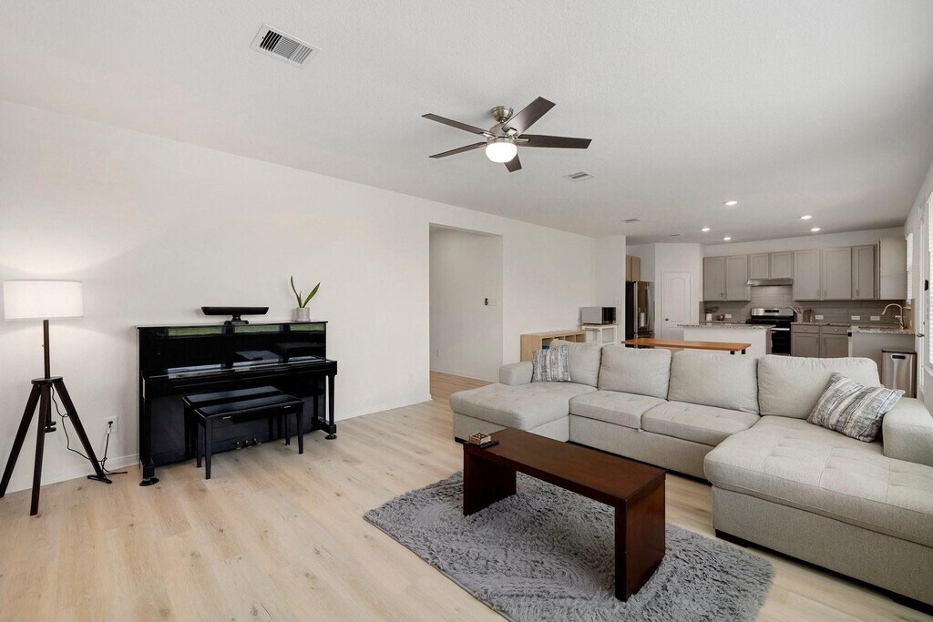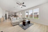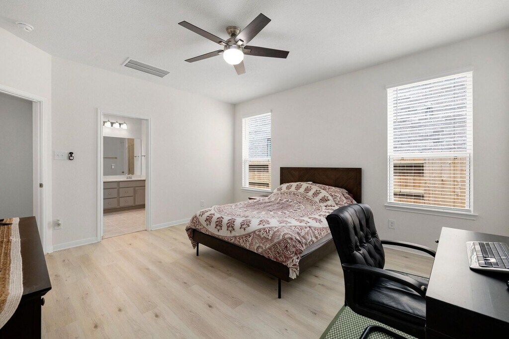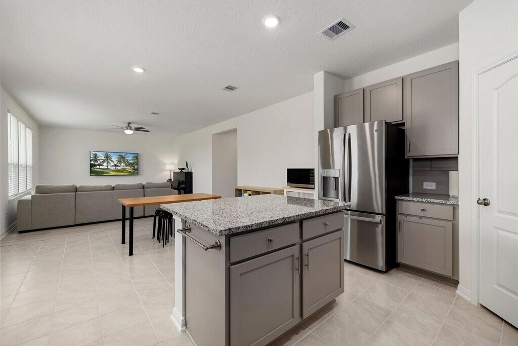 Come view this bright, contemporary home has a fantastic layout with separation between primary and secondary bedrooms for the ultimate privacy. Thoughtful upgrades include luxurious vinyl plank flooring, amazing oversized shower with seating in the primary suite, spacious island kitchen with granite countertops, stainless appliances with gas cooking, and soft close cabinets and drawers. Outside you'll love the expansive covered patio and easy maintenance of the inground sprinkler system. For added peace of mind, all builder's warranties are transferable! Nestled in the amenity filled community of Marvida, you will delight at the Island Village with lazy river, tennis, volleyball..it's a vacation in your own back yard! Do not miss this amazing opportunity, come see this immaculate home today and make it yours!