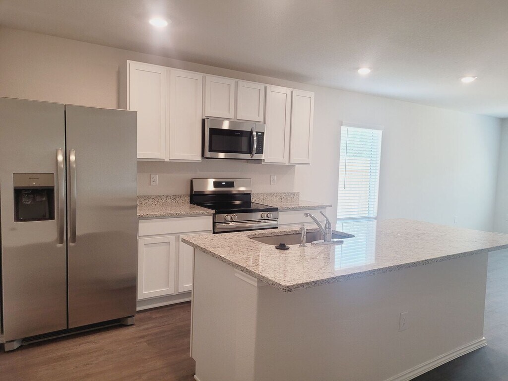 Welcome to your dream home in Elmendorf, TX! This "like new" 1-story, 4-bedroom, 2-bathroom home is a perfect blend of style and comfort. The open floor plan is perfect for entertaining. The kitchen boasts stainless steel appliances, granite countertops, a pantry, and an island with barstool seating area- making it a chef's dream. The home also includes a laundry room with washer and dryer hookups for your convenience. The primary bedroom features its own bathroom and a walk-in closet- providing ample storage space. The home is situated on a cul-de-sac in the newest, quiet back section of the neighborhood. Boasts a large backyard with no neighbors behind, and is enclosed by a privacy fence. The attached 2-car garage has a garage door opener. This home is pet-friendly, with a 2 pet limit upon approval. Built in 2024, this home is ready to welcome you to a life of comfort and convenience. Located right off Hwy 181 between Calavaras Lake and Braunig Lake, just southeast of San Antonio. ***$1525 for a 15 to 18-month lease***Minimum 15-month lease***