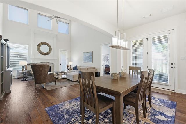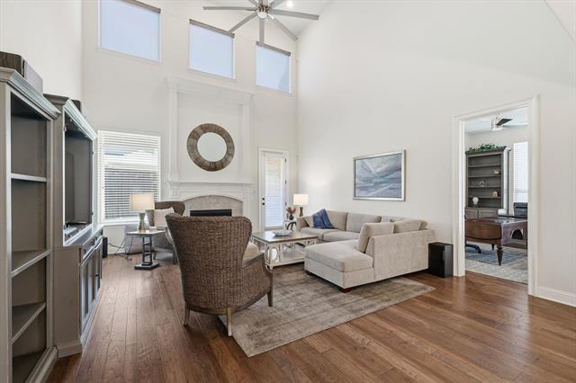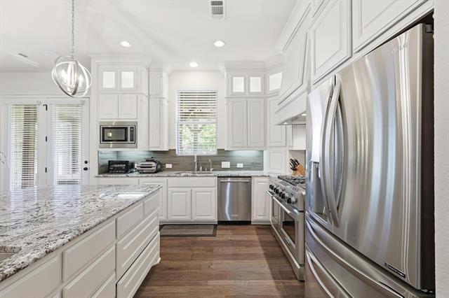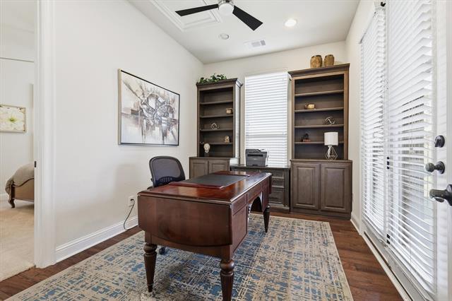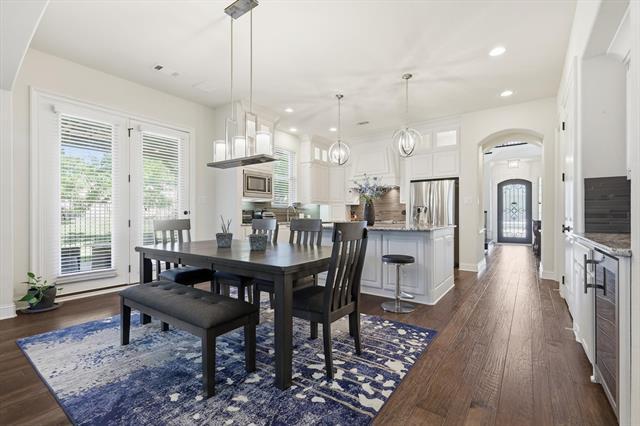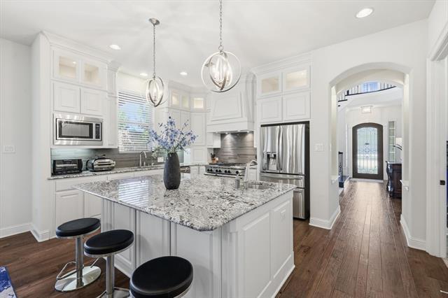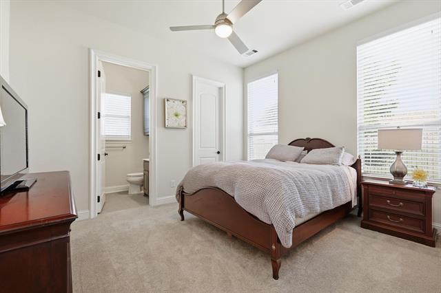 Ready for immediate move-in. This home comes furnished with all furniture shown in photos and includes a refrigerator, washer, and dryer. Located in Coppell ISD, students can easily bike to all nearby schools. The two-story foyer opens to a formal dining area and light, bright interiors. The kitchen features granite counters, stainless KitchenAid appliances including a six-burner range with griddle and double ovens, plus a beverage fridge. From the kitchen, step out to the side patio with a pergola and grill, perfect for outdoor dining. The family room showcases vaulted ceilings, a fireplace, and access to the backyard with a second covered patio. Off the family room is a private study that connects to a full guest suite. The primary suite is also on the main level and includes dual sinks, a large walk-in shower, tub, and 2 spacious walk-in closets. A half bath for guests and the laundry room complete the first floor. Upstairs offers three additional bedrooms, two full baths, and a media room complete with projector, screen, and equipment. The floorplan is perfect for a multi-generational family. The home also features a three-car garage, extra storage closet in garage and storage shed out back. Front yard maintenance is included through the HOA. Pets are case by case basis.