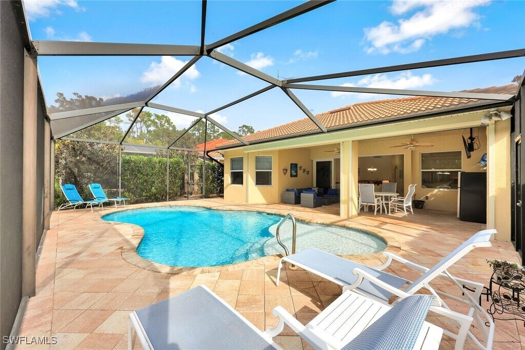 Experience the pinnacle of Southwest Florida living in this impeccably maintained luxury seasonal or annual executive rental located within the exclusive gated community of Firano at Naples. This spacious three-bedroom plus den,two-and-a-half-bathroom residence features over 2,200 square feet of open-concept living space highlighted by soaring vaulted and tray ceilings and elegant tile and wood flooring throughout. The gourmet kitchen serves as the heart of the home,offering granite countertops,stainless steel appliances,a breakfast bar,and a sun-drenched eat-in kitchen area alongside a formal dining room that comfortably seats eight. The primary suite is a true retreat with a king-sized configuration,flat-screen television,and direct views of the pool,complemented by a spa-like master bath with dual sinks,a deep soaking tub,and a large luxurious shower. Outdoor living is redefined on the expansive screened-in lanai,where you can enjoy a custom heated pool and desirable western exposure for breathtaking sunset views over a private preserve backdrop. This turnkey furnished home is fully equipped for immediate occupancy and includes a large outdoor living space with a television and premium lounge seating for ultimate relaxation. Situated in a prime Naples location,this home is just minutes away from the world-class shopping and fine dining of Fifth Avenue South and Third Street South,the iconic Naples Pier,and white sandy beaches. Sports enthusiasts will appreciate the close proximity to the renowned pickleball courts at East Naples Community Park,while nature lovers are a short drive from the Naples Botanical Garden. Community amenities include a clubhouse,fitness center,and resort-style pool and spa. A thirty-day minimum lease is required,and no pets are permitted per the association.