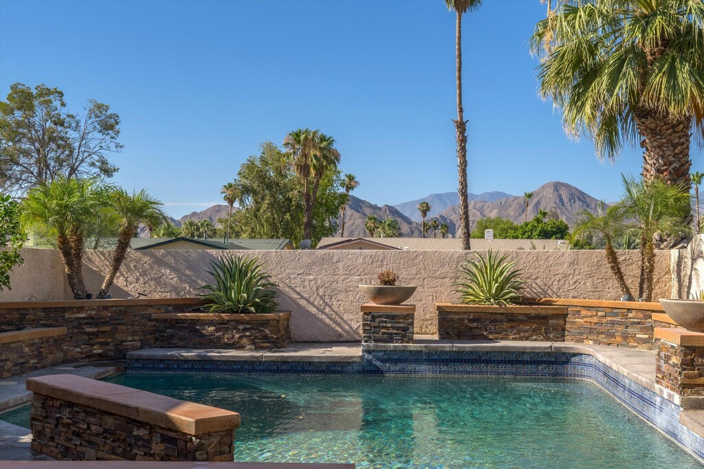 The main photo says it all- Welcome to this charming 3 bed 2 bath 1400+ sq foot single family home in the desirable non gated community of Palm Desert Country Club community. From your private,gated pool area,enjoy spectacular southern mountain views while relaxing by the built in fire pit,sunken spa or under the covered seating area on the stamped concrete patio. As you move toward the main entrance you will find a cozy outdoor dining space with convienent pass through to kitchen. Inside the living room highlighted by vaulted ceiling,full stone fireplace,oversized patio doors that open directly to the pool perfectly framing those breathtaking southern mountain views. Kitchen has been updated w/ SS appliances,granite counters & ample cabinets. Garage access comes right into the kitchen. Primary bedroom features en suite bath and private patio door leading to the back yard. The 3rd bedroom is a versatile space,also with patio access,ideal for a guest room,office,or hobby area. The spacious back yard is enhanced with a new paver patio providing even more outdoor space. Palm Desert CC Golf course is just down the street and your minutes from world-famous Indian Wells Tennis Gargen home to the BNP Paribas Tennis tournament. Shopping,groceries,access to Interstate 10 or the new Acrisure Arena,home to the Coachella Valley Firebird AHL hockey team is all just a short drive away.