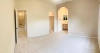 This lovely home has a bright open floor plan with a large great-room, formal dining room with mountain views and kitchen with breakfast bar, gas stove, and microwave. Three spacious bedrooms including master with walk-in closet and bath with dual sink vanity. Fully landscaped corner lot with low maintenance xeriscape in front and open patio and small area of grass in back. Additional features include refrigerated air and security wrought iron. $250 pet deposit, $25 pet rent Single family home