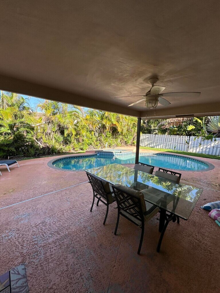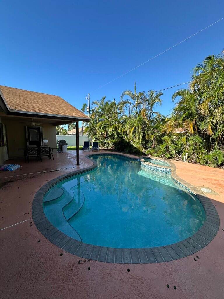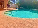 Great Swimming pool and Spa Tub with new heater behind Fantastic Just Painted home with open floor plan, vaulted ceilings and split bedrooms in the perfect location. Tiled and/or wood laminate floors for easy cleaning. Newer kitchen with granite loaded with cabinets. Secondary bathroom remodeled with new floor to ceiling tile.Newer AC. W/D included. Home is meticulously maintained. Sod with sprinkler system with lawn maint. included. Beautiful Pool with maintenance included. Pass through from kitchen to pool area with granite bar. Fenced yard. 2 Car garage. **Property occupied by tenants. Will be available to move in Sept 15, 2025**