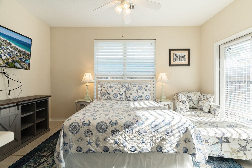 Welcome to Blu Flamingo, a unique property offering a spacious split layout with a 4-bedroom, 4-bath main home and a 2-bedroom, 1-bath carriage home. Feel at home as you enjoy the private pool in a fully gated backyard, perfectly situated between the two homes. Located in the desirable Crystal Beach neighborhood, this property is just a short walk to public beach access, and includes a complimentary 6-passenger golf cart for easy cruising around the area. Experience the Blu Flamingo lifestyle with a peek-a-boo view of the Gulf of Mexico from the back balcony. The main home features a cozy living room with Roku-enabled TVs, Hulu Live, and speedy Wi-Fi for endless entertainment. The fully equipped kitchen includes a fridge, dishwasher, range, microwave, and more, with seating for 8 at the dining table and 4 at the breakfast bar. A full-size washer and dryer are available for your convenience. The property offers optional pool heating for an additional fee. Pets are welcome with a maximum of 2 house-trained dogs allowed, subject to a $200 non-refundable pet fee. Emotional Support Animals are also subject to the pet fee, while ADA-registered service animals are exempt. The driveway accommodates up to 3 vehicles, and the golf cart is included with your stay. Nestled in the Crystal Beach neighborhood, Blu Flamingo offers easy access to the public beach, just a short walk away. The complimentary golf cart makes exploring the area a breeze, with many beach access points along Scenic 98 easily reachable. The property is approximately a 30-minute drive from Destin-Fort Walton Beach Airport (VPS). Check-in is at 4:00 PM CST and check-out is at 10:00 AM CST. Early check-in and late check-out may be possible upon request. The property does not allow student groups or guests under age 25 without a parent or guardian. Pets must be approved in advance, and guests are expected to clean up after their pets to avoid additional fees. The golf cart requires a waiver to be filled out prior to arrival, and drivers must be 25 years or older with a valid license and current vehicle insurance. Pool heating is available for a seasonal fee upon request. Only registered guests are allowed on the property, and events and parties are not permitted. Trash must be taken to the curb on designated days to avoid additional charges. The property is equipped with speedy Wi-Fi, making it remote work-friendly. [SI]