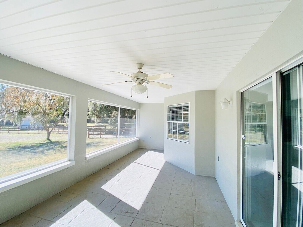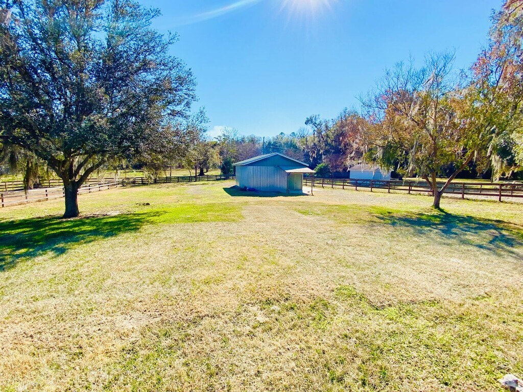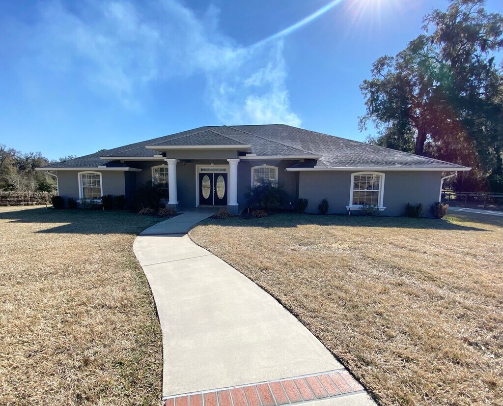 .....describes this four-bedroom home sitting on an acre of A1 zoned land with a paved driveway perfectly, with its side entry two car garage, large yards, and RV parking in the rear. The EXTERIOR of the home - has fresh paint, a new architectural shingled roof, fenced yard, mature landscaping, and a winding sidewalk leading to a tiled FRONT PORCH with security cameras and double door entry that welcomes you into the INTERIOR - where the brand new decorative tile design in the FOYER leads you into an open floor plan that's perfectly complimented by a carefully selected wall color, high ceilings, and light fixtures spanning from the FORMAL LIVING ROOM/STUDY across and into the FORMAL DINING ROOM - both with a large windows that allows natural light to come in. From the dining room you can directly access the KITCHEN - which has an abundance of cabinet space, a pantry cabinet, Whirlpool stainless appliances, Delta faucets, a Culligan water filtration system filtering the faucet in addition to the fridge door water, and granite counters with bar seating adjacent to the BREAKFAST NOOK with sky lights - that overlooks the wonderful back yard. You will find sky lights in the GREAT/FAMILY ROOM as well - where the aforementioned tile floors continue right up to the large sliding doors that lead you out onto the SCREENED LANAI where you have an even clearer view of the back yard and pole barn with electric and lots of storage. BONUS: future tenants can have access to the five acres directly across the street for $18 a day for one horse, $15 a day for additional horses. Pasture offers outdoor shelter/stall for four and two solid block stables for storms days. Water is provided for horses, but all other cares are the renters responsibility. 24/7 access to pastures. CALL TRACEY BROWN at for more info.