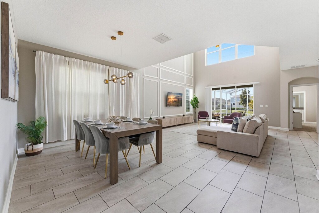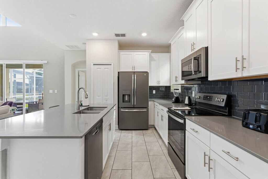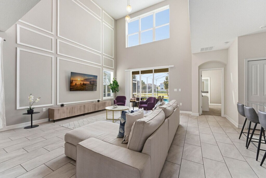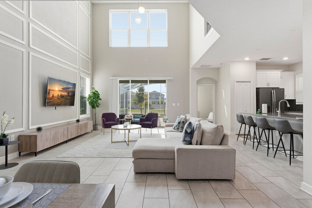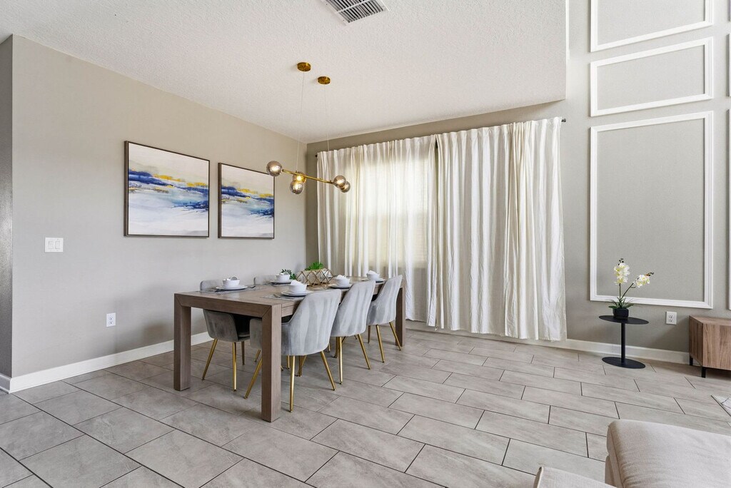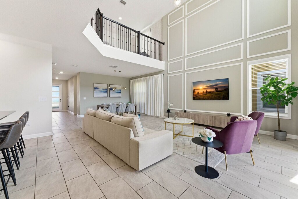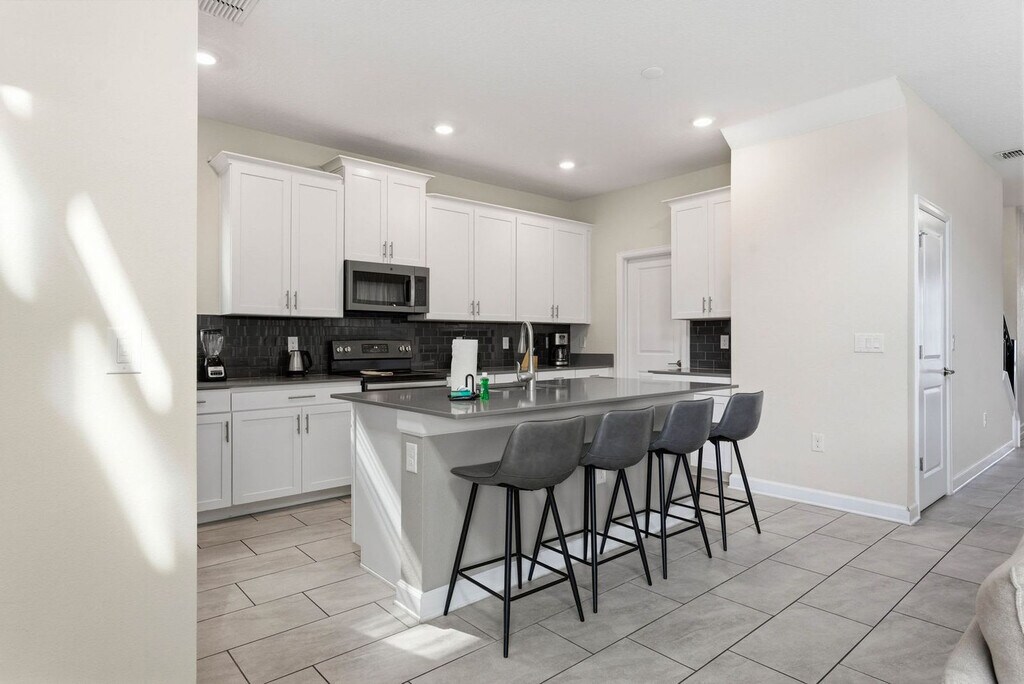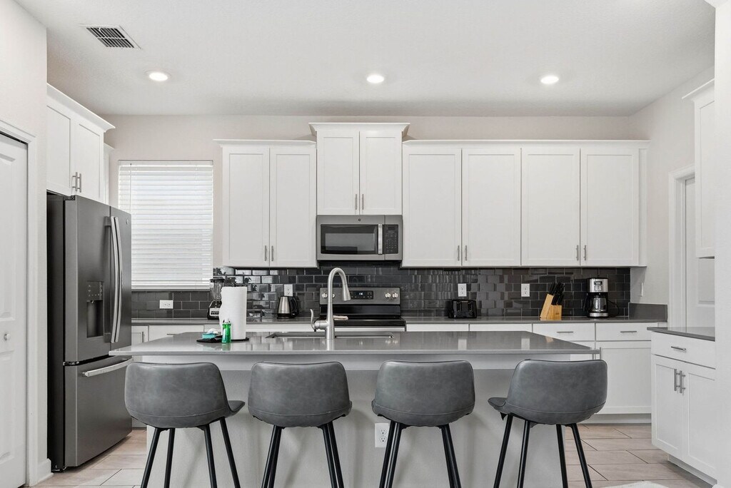 Feel at home in this spacious 5-bedroom, 5-bathroom home in Champions Gate, perfect for up to 14 guests. This home features an open-concept living space with a fully equipped kitchen, dining area, and lounge. Upstairs, you'll find a cozy family room. Additional features include a full laundry room with a washer and dryer, complimentary Wi-Fi, and a welcome kit with essential kitchen and bathroom items. Pool heating and a BBQ grill are available for an additional fee. Located in the Champions Gate Resort, you'll enjoy access to resort amenities including pools, a lazy river, splash zone, fitness center, and arcade. The resort is just 20 minutes away from Disney Parks, with shopping, dining, and supermarkets nearby. Quiet hours are between 10:00 PM and 8:00 AM. Smoking and pets are not allowed. [SI]