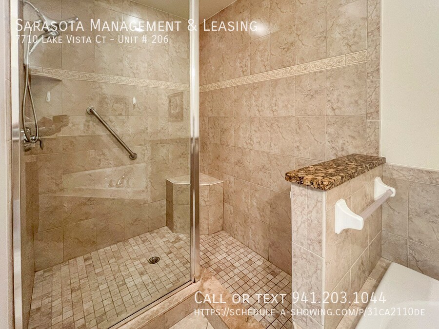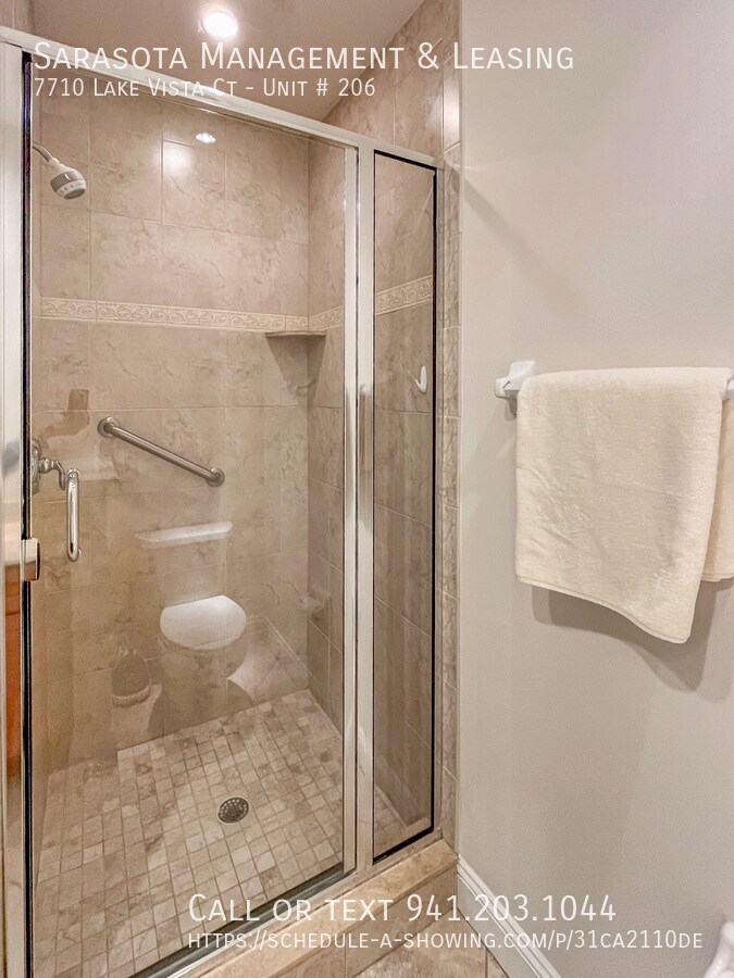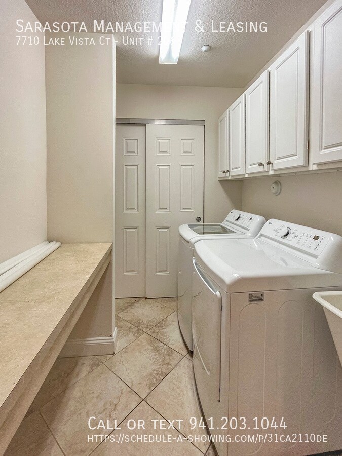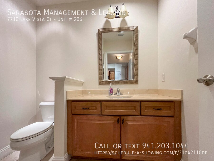 This is a second floor 3 bedroom, 2.5 bathroom condo located in the gated community of Lake Vista Residences in the heart of Lakewood Ranch! The building has a beautiful lobby and elevator. The unit features a foyer with vaulted ceilings and an open split floor plan with a combined dining and living room leading to a private screened rear patio overlooking the preserve. The kitchen offers ample space, with an island and breakfast bar, granite counter tops, black appliances, a tile backsplash, and a closet pantry. The large master suite boasts tray ceilings and sliding door access to the balcony. The master bathroom features a large vanity with dual sinks, walk-in shower, a soaking tub and his and her walk-in closets. There are two spare bedrooms and a spare bathroom with a walk-in shower. There is also a guest half bathroom located near the entrance of the condo. The large finished laundry room includes upper cabinets for extra storage and a built-in counter and sink. This unit also includes a reserved parking space and extra storage. Pickup trucks longer than 17 ½ feet long are not permitted to park in the parking garage. Lake Vista residences include a clubhouse with a fitness center, a resort-style pool and spa, and a grill area by the pool. It is located close to Lakewood Ranch Hospital and within minutes from Main Street Lakewood Ranch which has lots of activities, restaurants, shops, a theater and put-put golf course. Please allow up to 2 weeks after lease signing for community approval before move-in. We score every application. If an application doesn’t score high enough, the resident may be required to place the equivalent of two months’ rent in a security deposit. Please be aware that leasing this property includes a non-optional Home Assistant Services Package that will cost an additional $30 per month. These services and their cost are separate from Tenant’s monthly rent payment and all other payments described in the Lease or any separate Lease addendums. The Home Assistant Services offered are described in the Resident Welcome Packet which can be viewed here: No Pets Permitted for Tenants per HOA Lakewood Ranch Hospital, Downtown Lakewood Ranch Lakewood Ranch Schools 1 Garage Parking Spot (206), Guest Parking Island with Breakfast Bar, Granite Countertops, Black Appliances, Tile Backsplash, Closet Pantry Open Split Floor Plan Resort-Style Pool and Spa, Clubhouse, Fitness Center, Grill Area Garbage included Sewage included Clubhouse Community Pool One Car Garage Pest Control Included Screened Porch Sewer Included