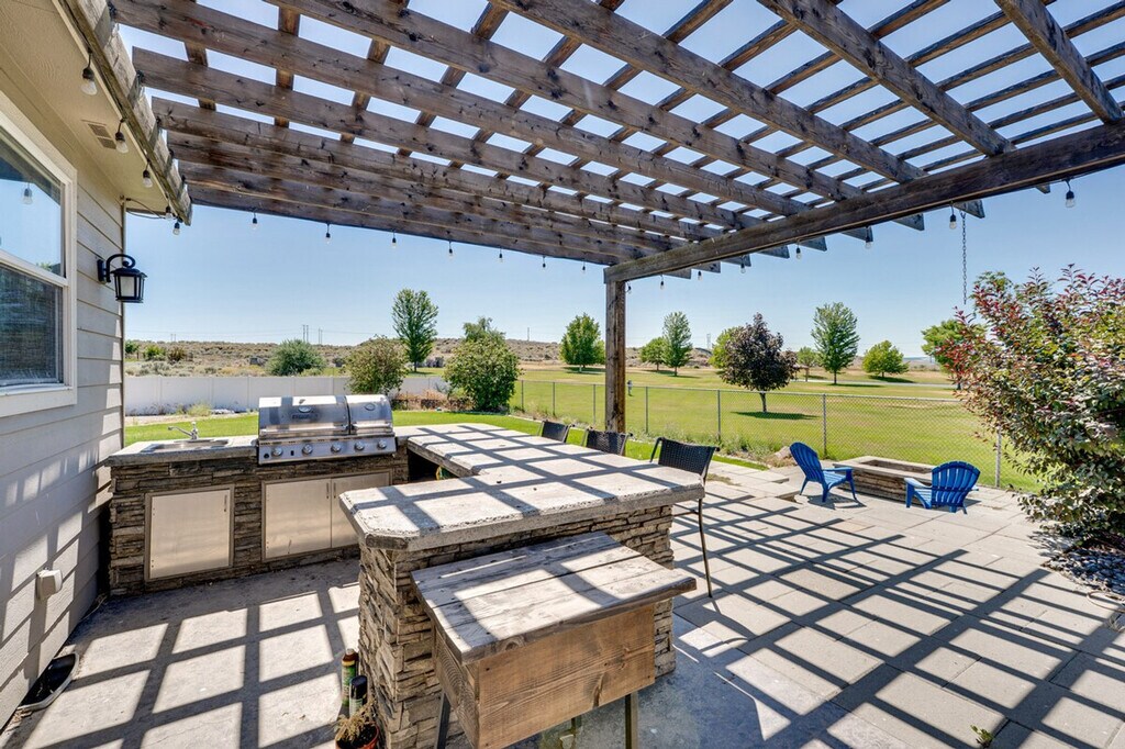 Adventure meets relaxation at this welcoming vacation rental, just a short walk from Moses Lake's tranquil waters. Feel at home in this 3-bedroom, 2.5-bath home with 3,000 square feet of living space. This home features a large fenced backyard, patio, a private outdoor pool with a slide, a fire pit with seating, and an outdoor kitchen with a gas grill and smoker grill. Inside, you'll find high ceilings, lake views, smart TVs, a gas fireplace, an en-suite bathroom with a jetted tub, a walk-in closet, and a dining table. The kitchen is equipped with a refrigerator, stove/oven, dishwasher, microwave, blender, cooking basics, spices, and an ice maker. Central heating and A/C, a washer/dryer, laundry detergent, linens/towels, and complimentary Wi-Fi are also provided. Located a 1/2 mile from Dune Lake Park, this home is near boating and off-road vehicle trails. There is no smoking, pets, events, parties, or large gatherings allowed. Guests must be at least 18 years old to book. This property features 7 exterior security cameras: 1 camera is located on the front of the home facing the driveway, 1 camera is located on the front of the home facing the front yard, 1 camera is located near the front door facing the front outdoor entry, 1 camera is located on the back of the home facing the back outdoor entry/patio, 1 camera is located on the back of the home facing the backyard, 1 camera is located on the back of the home facing the pool, and 1 camera is located in the garage facing the parking area. The cameras do not look into any interior spaces and record video and sound when activated by motion. This is a 2-story home that requires exterior stairs to enter; the first floor includes 1 bedroom and 1.5 bathrooms. The garage and hot tub are not available for guest use. Includes a dedicated workspace with 2 monitors. [SI]