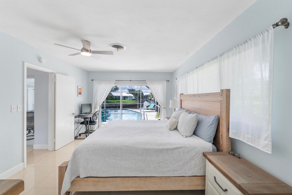 Awesome Florida Lifestyle with the gorgeous, long water views in prestigious Camino Gardens. Enjoy taking off for water sports at your Private Dock on 100 foot waterfront seawall. Solar heated Pool Located on two lots, a quiet cul de sac street in East Boca close to the beaches, restaurants, shopping, nightlife, fitness centers, beach yoga, Trader Joes, Town Center Mall, Mizner Park FAU, A+ schools, Pets welcome! The interior features include spacious living and dining rooms, an open kitchen with stainless steel appliances, double ovens, granite countertops, Master Suite, walk-in closets in every bedroom, a cabana bath, laundry room with sink, a bonus wall to wall cedar lined closet, crema marfil porcelain tile floors, and modern ceiling fans.