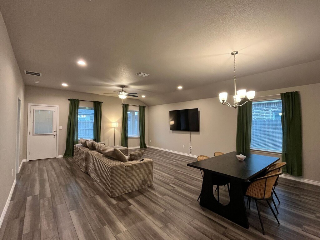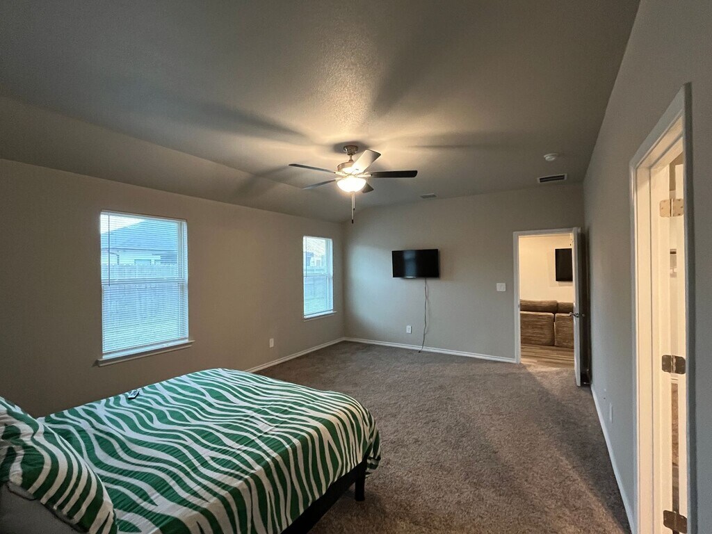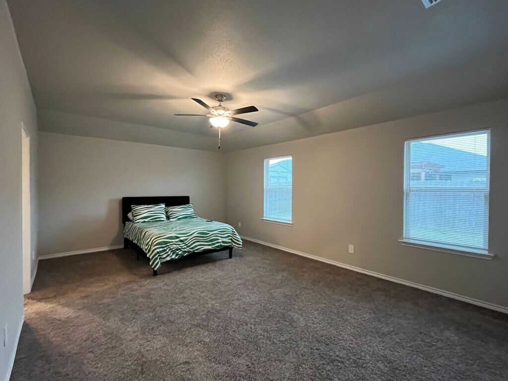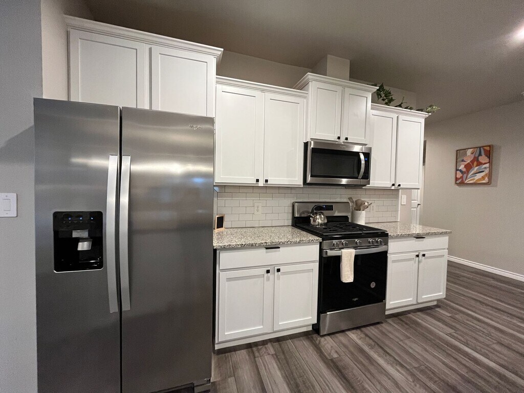 Spacious four bedroom two bath house with split bedroom floorplan in Starlight Estates on the South Side. Granite countertops and luxury vinyl plank throughout. Carpet in the bedrooms. Walk into a small foyer that leads you into the kitchen with lots of countertop and cabinet space, five burner gas range, island with double basin sink and eat in breakfast bar, plus a separate pantry! Living room off the kitchen boasts lots of windows that allow for plenty of natural light to fill the rooms and provides access to the covered patio and fully fenced in backyard. Two bedrooms up front correspond to a hall bath with open shelving and tub shower combination. Third bedroom off the kitchen. Primary bedroom tucked away in the back of the house with plenty of room for large furniture boasts a walk in shower, double sinks, separate w.c. closet, and large walk in closet. Quick commute to schools, Bill Witt City Park, shopping, restaurants, grocery, and so much more! Call a Realtor today to schedule a showing.