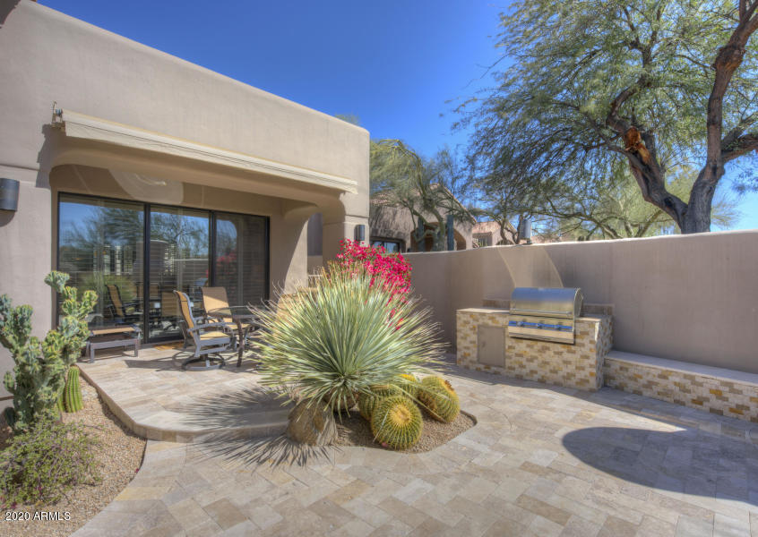 Resort Style Living! Make this beautiful property your home away from home! Fully Furnished. Tumbled travertine south facing patio with BBQ adjacent to the kiva fireplace. Mature lush landscape with a striking water feature. Beautifully updated 3 bedroom/plus office on a quiet interior lot. Eat in kitchen with Thermador appliances including double ovens with a warming drawer. Kitchen opens into the family room. Spacious master bedroom and master bathroom. Two additional guest bedrooms are en-suite baths.