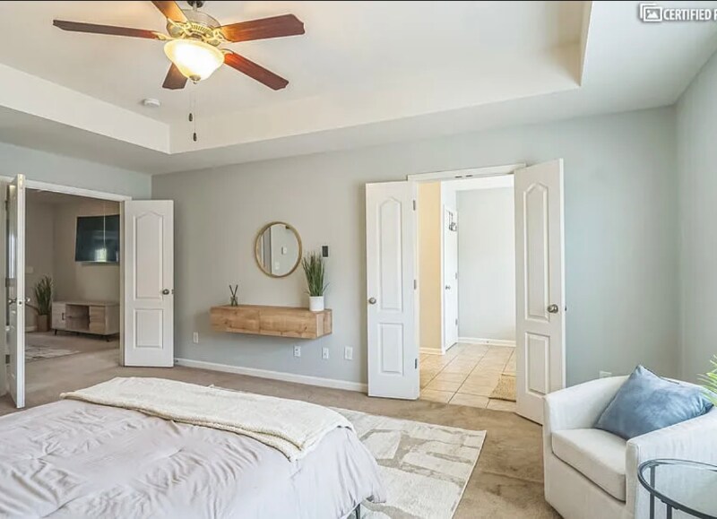 Property Id: 2396421 Beautiful corner-lot 3-bedroom, 2.5-bath townhome built in 2018, offering modern finishes and spacious design in a highly desirable Fairburn community. The brick-front exterior and rear-facing 2-car garage provide both curb appeal and functionality. Inside, dark hardwood flooring spans the entire main level, leading into an open-concept living space designed for comfort and entertaining. The kitchen features granite countertops, a large island, tiled backsplash, and clear sightlines into the dining and living areas. Coffered ceilings and a fireplace add architectural character and warmth to the main living space. Upstairs, a versatile loft provides additional living or office space. The oversized primary suite features tray ceilings, a ceiling fan, and elegant French doors leading into a private en-suite bathroom with dual vanities, tile flooring, a separate shower, and a soaking tub positioned beside a window for natural light. Two additional bedrooms are located upstairs, including one with private balcony access. The laundry room is conveniently located on the second level. Residents enjoy access to community amenities including a swimming pool, tennis courts, clubhouse, scenic water features, and walkable sidewalks throughout the neighborhood. Conveniently located near major highways with easy access to shopping, dining, and the Atlanta airport corridor. Financial expectations: Income-to-rent ratio: 3x (non-negotiable) Credit score: 650 or above (negotiable) Pets: Pet deposit: $450 Pet rent: $45 pet rent per month