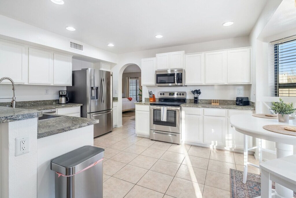 The advertised rate of $9,078/month is the lowest available price, based on a 30 day(s) stay with a move-in date of July 28, 2026. Rates vary depending on the duration of stay, season, and other parameters. For exact pricing and additional pricing components, please visit our website and enter your desired move-in and move-out dates. The rate is applicable when billed upfront; it can be higher if billed in multiple payments. This 6-bedroom house in the heart of Peoria is packed with amenities for a memorable stay. With 3.5 bathrooms, it comfortably accommodates up to 20 guests. The property features a heated pool, mini golf, sports court, fire pit, loungers, and a dining table, making it an outdoor oasis. Located just 2 miles from the Peoria Sports Complex and 15 minutes from State Farm Stadium, this home is ideally situated for sports enthusiasts. Welcome to Peoria Paradise, a spacious home in a prime location. Step outside to the outdoor oasis with a heated pool perfect for year-round enjoyment. The property features a mini golf course, sports court, and a game room equipped with air hockey, foosball, arcade games, connect 4, pool table, and ping pong. Relax by the fire pit or on the comfortable loungers while enjoying a meal at the outdoor dining table. Fitness enthusiasts will appreciate the in-home gym with a Peloton Bike, yoga mats, and dumbbells. The bedrooms are thoughtfully designed for comfort, with Bedroom 1 featuring a luxurious king-size bed, Bedrooms 2 and 3 with queen beds, Bedroom 4 with a full bed, and the basement offering Bedroom 5 with two queen beds and Bedroom 6 with two full over full bunk beds. Each bedroom is equipped with a 40-inch smart TV. Dogs are welcome for an additional fee of $125 per stay, with up to 2 dogs allowed. The heated pool fee is $100 per night, and the pool can be heated to about 20-25 degrees above the ambient temperature. We recommend heating the pool between October and May, with a 3-day notice required before arrival. Parking is available with a driveway that can accommodate 3 cars and additional street parking. This property is ideally located just 2 miles away from the Peoria Sports Complex, home to Mariners and Padres Spring Training. It's only a short 15-minute drive to State Farm Stadium and the Westgate Entertainment District, Diamond Casino, and Top Golf. The neighborhood offers a variety of dining options, including Ballpark Pizza and Subs, Bee Happy Boba Tea, Someburros Peoria, and more. Grocery stores like Walmart Neighborhood Market and Sprouts Farmers Market are nearby, along with shopping centers such as Thunderbird Commercial Plaza and Arrowhead Towne Center. The primary guest must be at least 25 years of age to book this property. No parties or events are allowed, and any gatherings will result in a minimum fine of $2,000 and an immediate check-out with no refund. The home is equipped with a Minut device to monitor noise levels. The neighborhood is tranquil and best suited for guests seeking a relaxing getaway. An exterior camera is located by the front door for security purposes. A guest verification process is required within 48 hours of booking confirmation, including signing a Rental Agreement and providing a valid ID and credit card. A non-refundable $60 damage waiver is also required, covering accidental damage during your stay. Stay connected with high-speed internet throughout the home. Registration Number: VST23-000116 [SI]