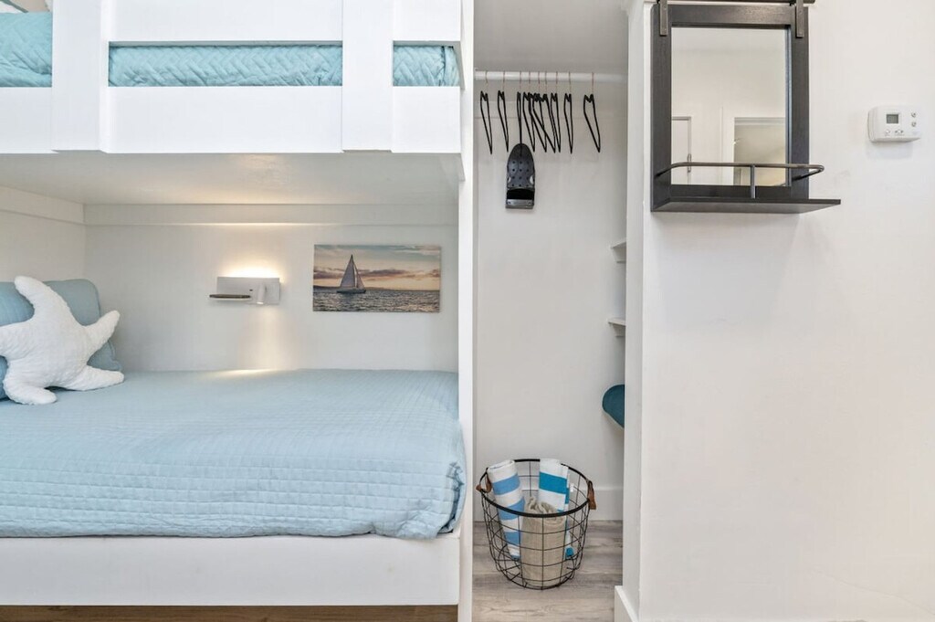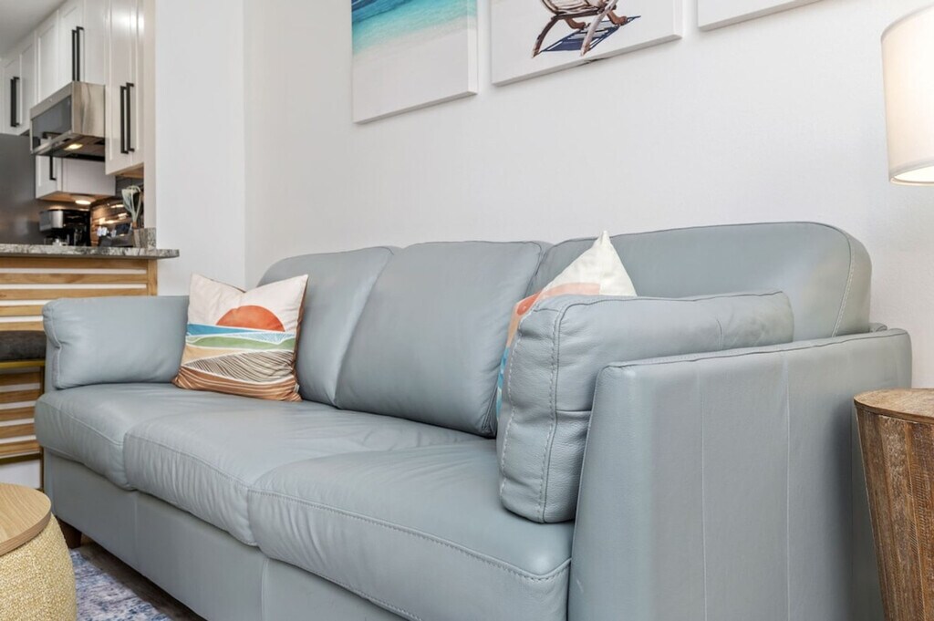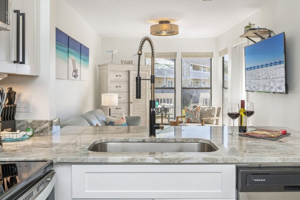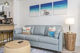 Come and feel at home in The Emerald Gem, a cozy 1-bedroom, 1-bath condo located in the gated community of Sandpiper Cove. This first-floor unit is just a few steps up from the parking lot, accessible by stairway only. This modern condo features a fully stocked kitchen with high-end granite countertops, a breakfast bar with seating for four, a fridge, dishwasher, range, microwave, dishes, cutlery, pots and pans, crock pot, blender, toaster, and griddle. There is a spa-like bathroom with an oversized tub and glass enclosure, as well as a washer and dryer in the unit. The living area includes a soft leather sofa that converts to a queen-size bed with a memory foam mattress. The intimate bedroom features a queen-size bed, and there are built-in twin bunks in the hallway. Beach service is included with the unit from March 1st to October 31st, providing one umbrella and two chairs. Pets are allowed, with a maximum of two dogs or cats 35lbs or less for a $50 fee. Located in the heart of Destin, this condo is in the exclusive gated community of Sandpiper Cove. Enjoy a short 4-minute walk to the beach with 1,100 feet of private access, or walk to nearby restaurants. Shopping and local attractions are just a quick drive away. Guests must be 25 years of age or older, excluding children of the booked guest. ID verification is required at the check-in gate upon arrival. Smoking is prohibited in the condo or on the balcony, and a $250 charge will be enforced for odor removal. [SI]
