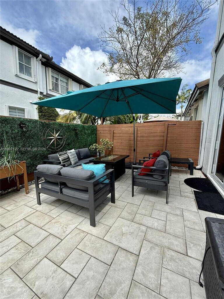 Live well with modern comfort and elevated living in this fully remodeled 3-bedroom, 2.5-bathroom townhouse in the heart of Doral. Designed with both style and functionality in mind, this home features a bright, open-concept layout on the first floor with sleek tile flooring throughout and a seamless flow between the living, dining, and kitchen areas—perfect for entertaining or everyday living. The contemporary kitchen is equipped with premium GE appliances, a whisper-quiet Miele dishwasher, and a state-of-the-art induction cooktop, offering both efficiency and sophistication. Upstairs, you’ll find durable heavy-duty laminate flooring, spacious bedrooms with floor-to-ceiling closets complete with custom organizers, and blackout blinds for privacy and comfort. The primary suite boasts a thoughtfully designed closet with a hidden safe for added security. This home is loaded with high-end upgrades, including impact windows, a full security camera system with facial recognition, surround sound throughout, and ambient lighting that enhances every space. Enjoy a whole-home water softener system with 9.5 pH alkaline drinking water at the kitchen sink and 7.5 pH throughout. Step outside to a paved patio—ideal for relaxing or hosting guests. Includes a 1-car garage plus driveway parking for 2 cars. Conveniently located near major highways, top-rated schools, parks, shopping, and dining. Move-in ready. MLS # A11997122